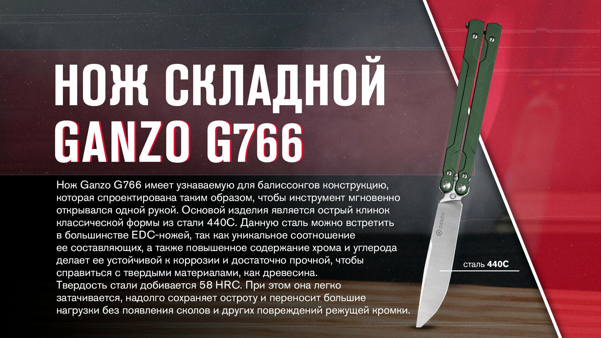 Нож Ganzo G766 имеет узнаваемую для балиссонгов конструкцию, которая спроектирована таким образом, чтобы инструмент мгновенно открывался одной рукой. Основой изделия является острый клинок классической формы из стали 440C. Данную сталь можно встретить в большинстве EDC-ножей, так как уникальное соотношение ее составляющих, а также повышенное содержание хрома и углерода делает ее устойчивой к коррозии и достаточно прочной, чтобы справиться с твердыми материалами, как древесина. Твердость стали добивается 58 HRC. При этом она легко затачивается, надолго сохраняет остроту и переносит большие нагрузки без появления сколов и других повреждений режущей кромки..