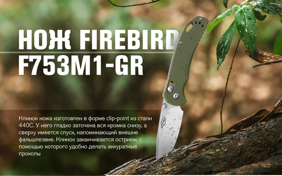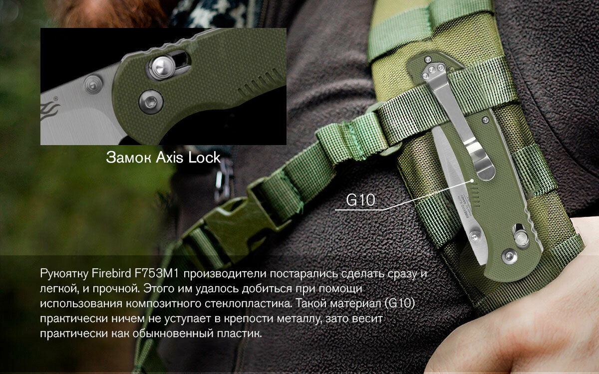 Нож Firebird F753M1 изготовлен таким образом, чтобы удовлетворить запросы сразу большого числа покупателей. Он подходит для всех видов туризма и других разновидностей активности на природе. Его так же успешно можно использовать и в городе. Данная модель сделана складной, что существенно облегчает ее перевозку. Более того, встроенный в нож замок, надежно блокирует ход лезвия по оси, чтобы оно не могло перемещаться самостоятельно при использовании ножа. В данном случае, это замок Axis, позволяющий легко открывать нож в случае надобности одной рукой.
