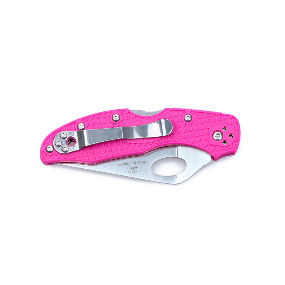 Сама рукоятка сделана из прочного синтетического материала — стеклонаполненного нейлона. Накладки прикручены пятью болтами, а клипса ножа — еще тремя. Клипса может размещаться в четырех положениях. Цвет рукоятки покупатель может выбрать из нескольких доступных вариантов: черный, оранжевый, розовый и голубой.
