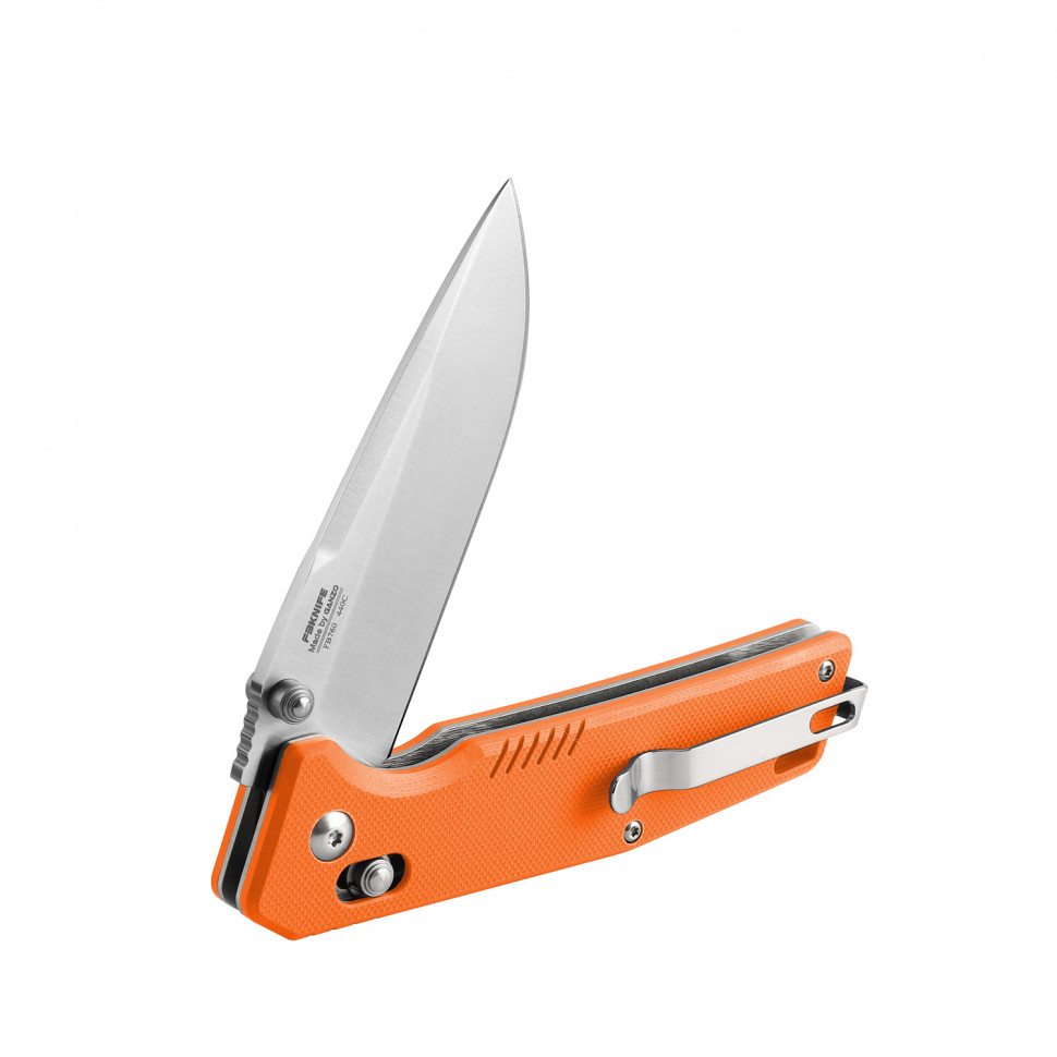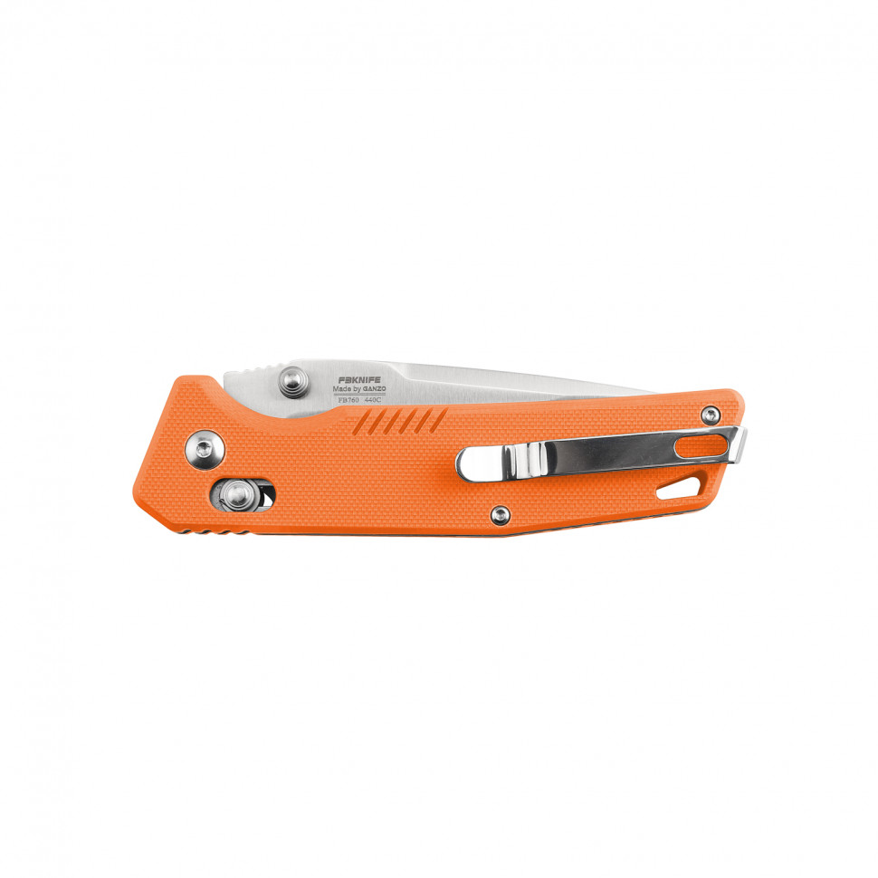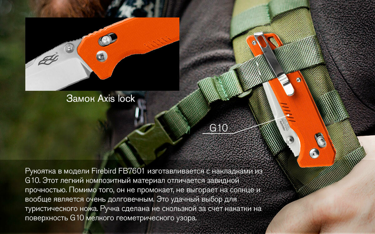 Рукоятка в модели Firebird FB7601 изготавливается с накладками из G10. Этот легкий композитный материал отличается завидной прочностью. Помимо того, он не промокает, не выгорает на солнце и вообще является очень долговечным. Это удачный выбор для туристического ножа. Ручка сделана не скользкой за счет накатки на поверхность G10 мелкого геометрического узора. Имеется и клипса, которая позволяет закрепить нож.