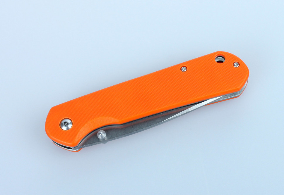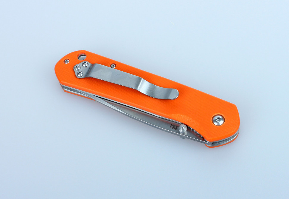 Чтобы нож Ganzo G6801 было удобно держать в руке, на его рукоятку прикреплены накладки из высокопрочного пластика под названием G10. Это долговечный материал, который не поддается коррозии и отлично сохраняет изначальные свойства. Поверхность рукоятки текстурирована, за счет чего нож крепко удерживается в руке при любых условиях. А для его закрепления в кармане, предназначена металлическая клипса. Помимо того, в рукоятке есть небольшое круглое отверстие под темляк для руки. Что касается внешнего вида рукоятки, покупателям доступны четыре варианта цвета: классический черный, популярные среди рыбаков и охотников темно-зеленый и камуфляжный, а также яркий и хорошо заметный оранжевый.