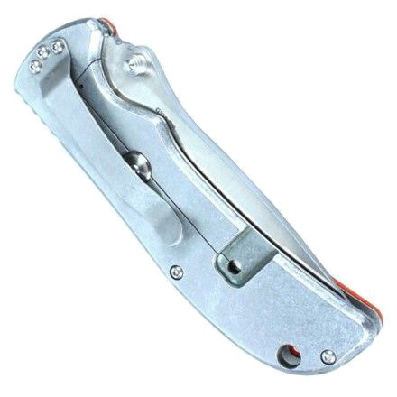 Основу рукоятки также составляет нержавеющая сталь. С одной стороны к ней крепится клипса для закрепления ножа, а с другой — рукоятка декорирована пластиковой накладкой. Поверхность накладки неровная, что позволяет крепче держать нож в руке. Доступные для выбора цвета — зеленый, оранжевый и черный. Помимо того, на ручке ножа есть сквозное отверстие небольшого диаметра. В него можно продеть ремешок для дополнительной страховки ножа во время работы и переноски.