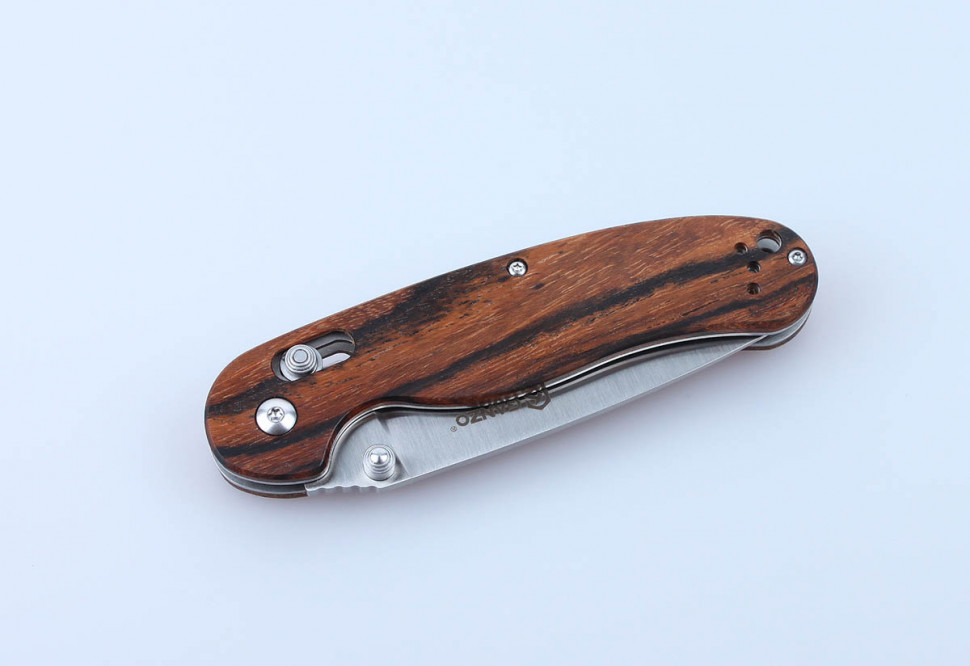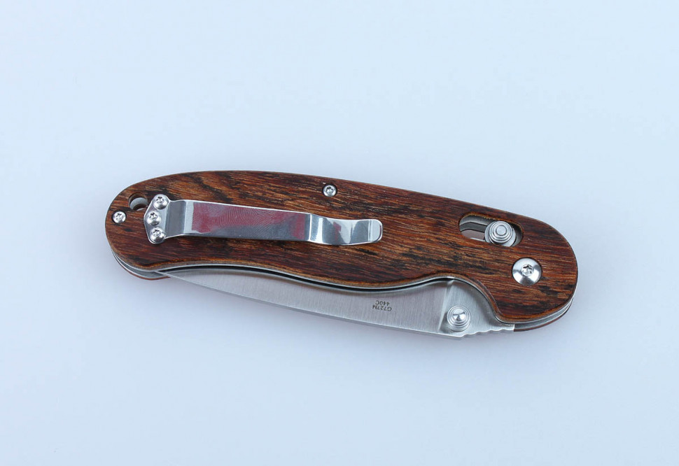 Рукоятка в данной модели привлекает особое внимание. Ведь она выполнена из натурального дерева, что для бренда Ganzo, в общем-то, не характерно. Производители выбрали древесину дерева эбени, которая относится к ценным сортам и известна своей высокой плотностью. Темная поверхность рукоятки с выраженной текстурой дерева понравится даже наиболее искушенному ценителю ножей. Тем более, что дерево прекрасно показало себя в длительной эксплуатации, а также использовании ножа в условиях высокой или низкой температуры. На рукоятке закреплена металлическая клипса для прикрепления ножа на ремне. Есть в ноже и еще один фиксатор — для клинка. Это замок типа Axis Lock, известный надежностью и длительным периодом эксплуатации. У него штифтовая конструкция, которая позволяет открыть нож, используя только одну руку.