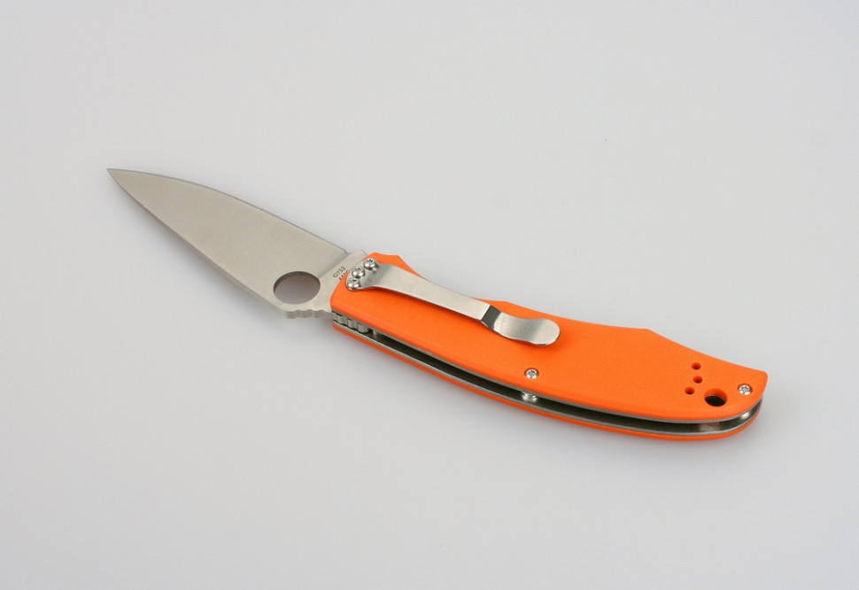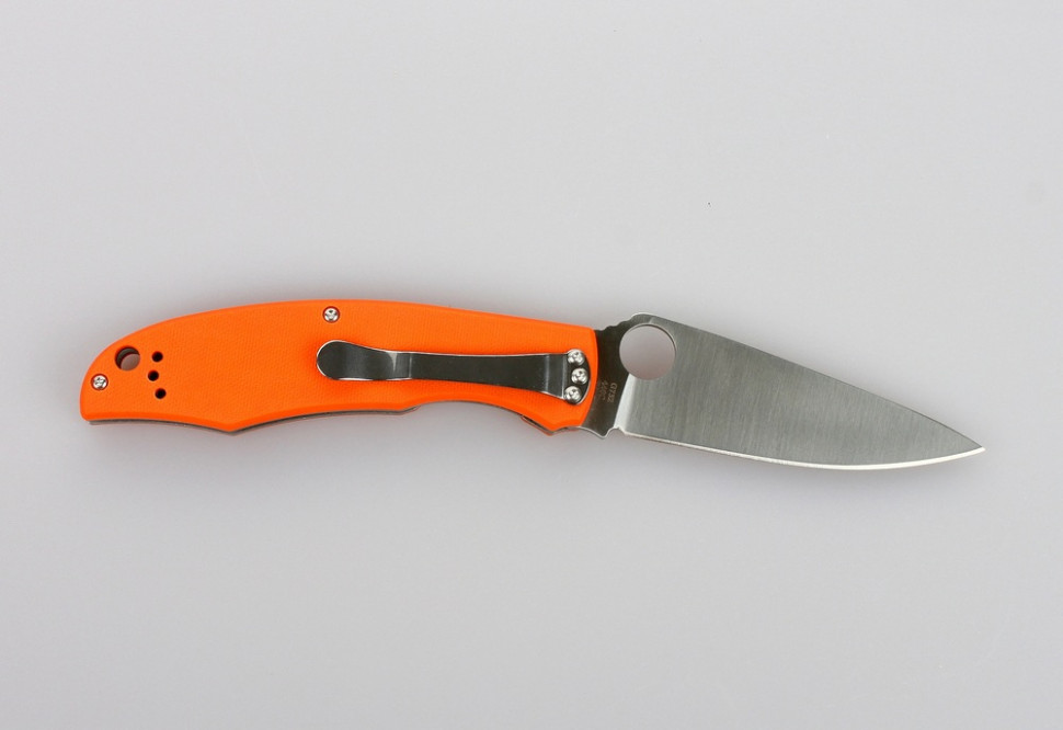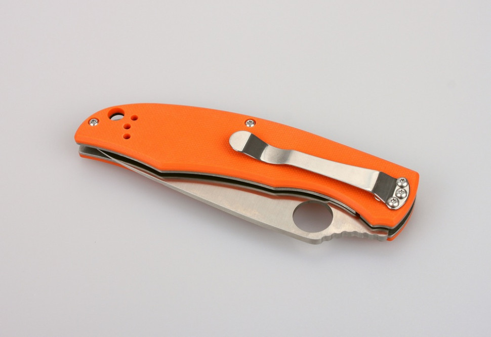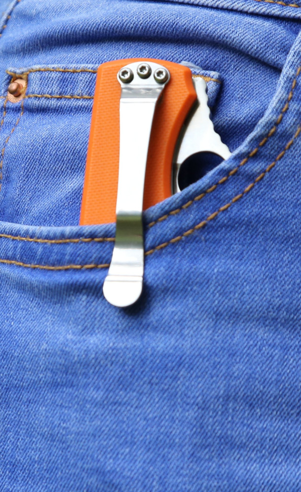 Основа рукоятки Ganzo G732 также металлическая, но на металле закреплены накладки из G10. Это современный вид композитного пластика, состоящего из стекловолокна и эпоксидной смолы. Ему легко придать необходимую форму и окрасить накладки в выбранный цвет. Так, данная модель может быть с черной, оранжевой, зеленой и камуфляжной рукояткой. В хвосте рукоятки есть небольшое отверстие для присоединения темляка. А ближе к клинку прикручена металлическая клипса для поясного ремня, которая держится на трех болтах.