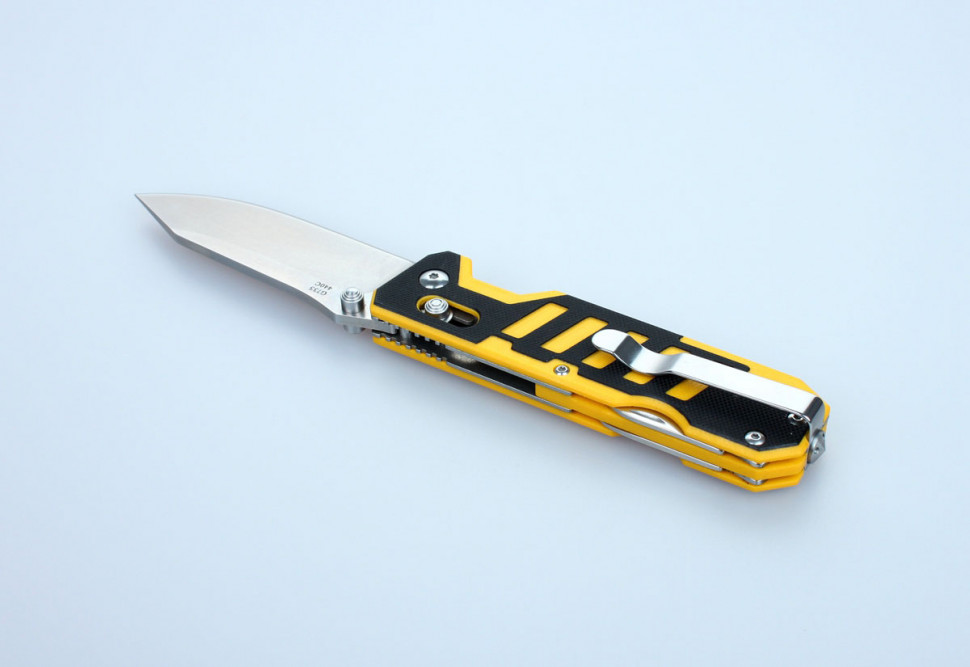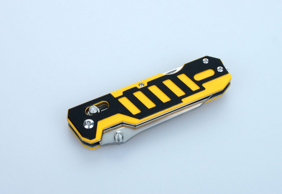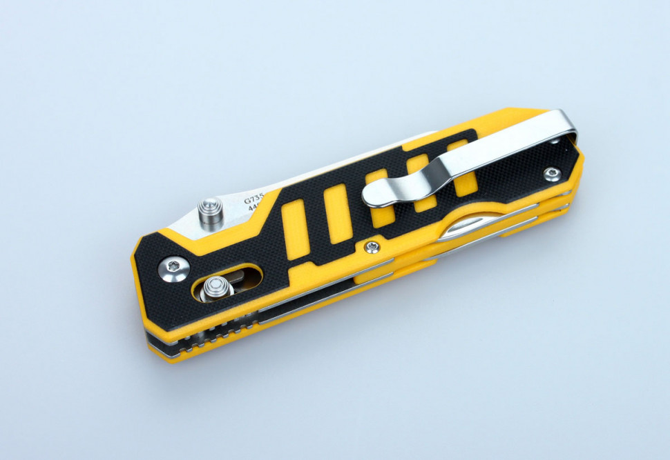 Рукоятка ножа изготовлена из материала G10. Это композитный стеклопластик, обладающий прочностью, сопоставимой с металлом, большой долговечностью и сопротивляемостью всем основным видам коррозии. Покупатели имеют возможность выбрать понравившийся нож и з четырех вариантов рукояток. Это уже традиционные черный, оранжевый и темно-зеленый, а также яркая и хорошо заметная на любой поверхности рукоятка желтого цвета с черными вставками. Естественно, на рукоятке размещена и прижимная клипса для дополнительной фиксации ножа в кармане или на лямке рюкзака.