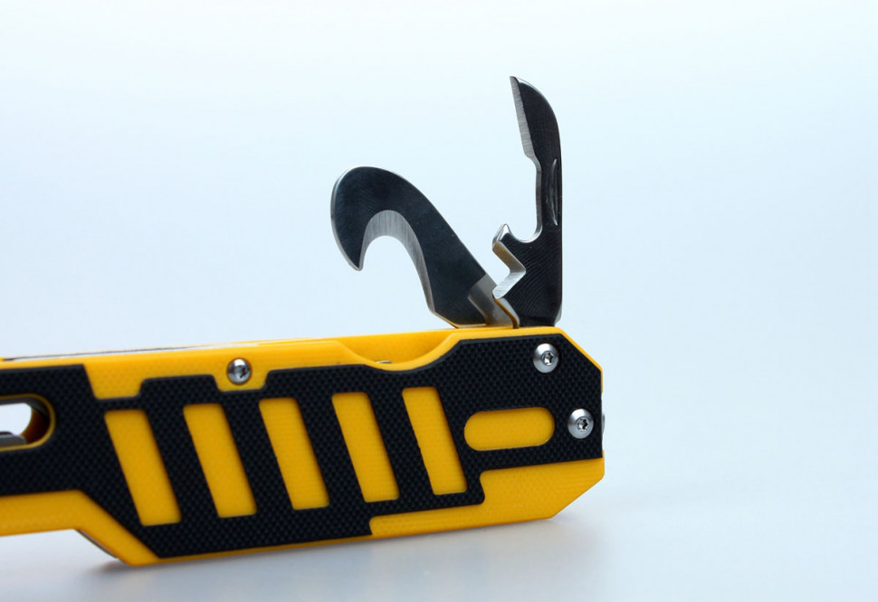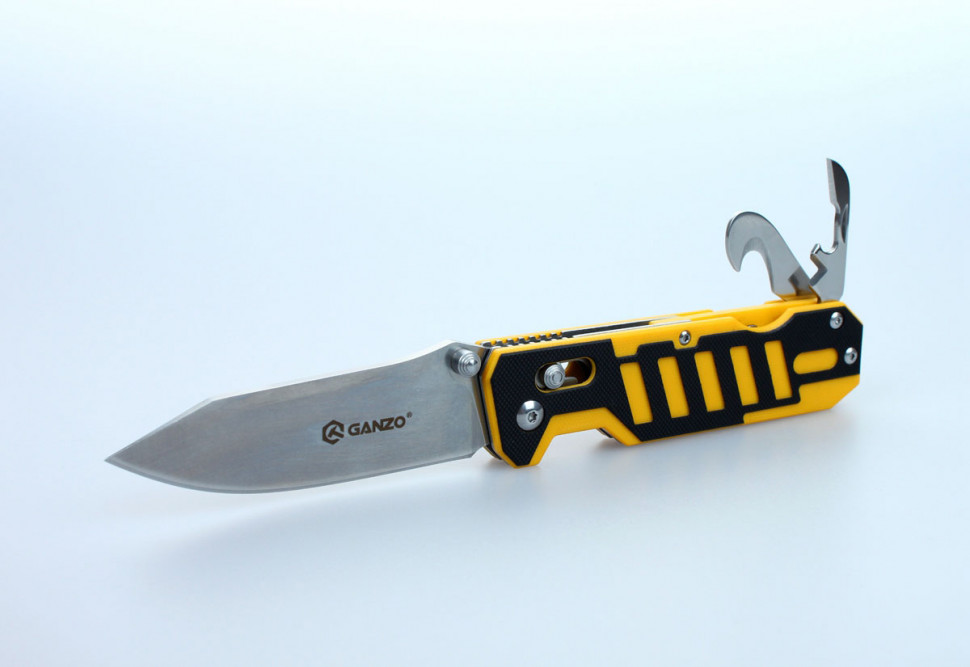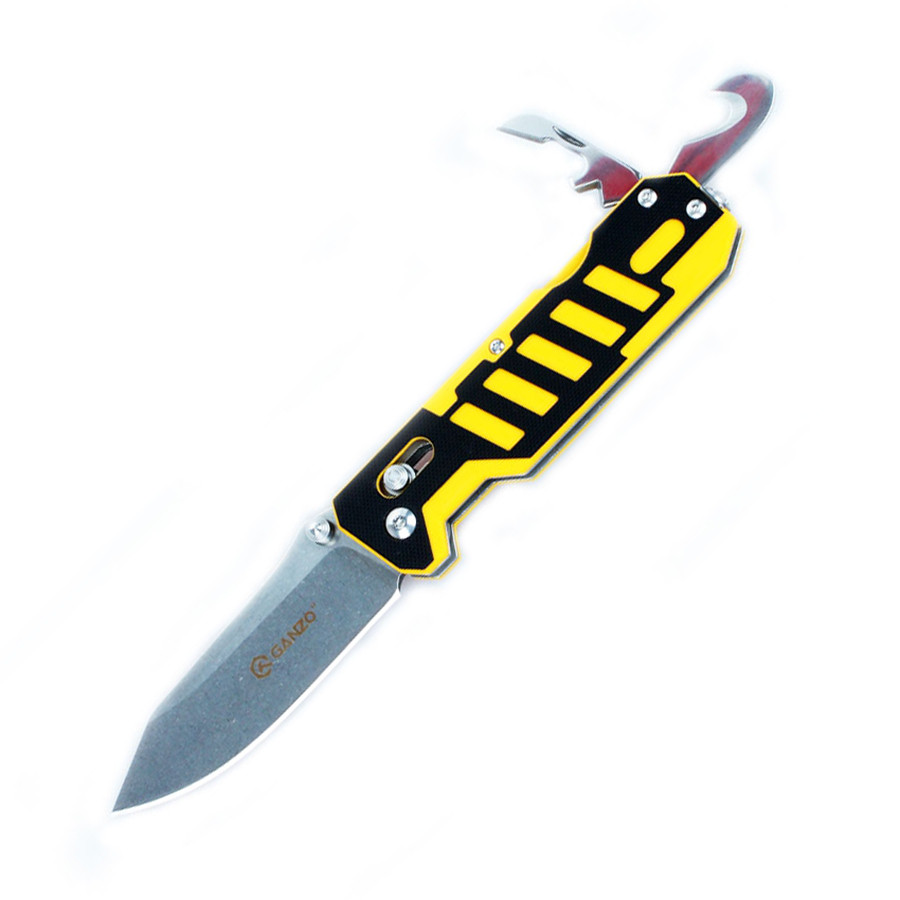 Если вы часто бываете на природе, да еще и увлекаетесь спелеологией, альпинизмом или туристическими походами, то модель Ganzo G735 создана специально для вас. Это практичный складной нож с дополнительными функциями, который справится как со стандартными задачами, возникающими во время отдыха за городом, так и со сложными ситуациями. Его основная часть — это гладко заточенный клинок из нержавеющей стали марки 440С. Длина лезвия составляет 8,6 см, а толщина обуха — 0,35 см. Сплав, из которого изготовлен нож, хорошо противостоит образованию ржавчины и долго сохраняет острую заточку. Твердость этой стали измеряется в пределах +- 58HRC. Из этого же металла сделаны и дополнительные инструменты, которые размещены в задней части рукоятки. Это открывалка для бутылок и консервных банок, в которую также интегрирован инструмент для зачистки проводов, и стропорез. Помимо того, в рукоятку встроен стеклобой, который может пригодиться не только спасателям, но и обычным пользователям.