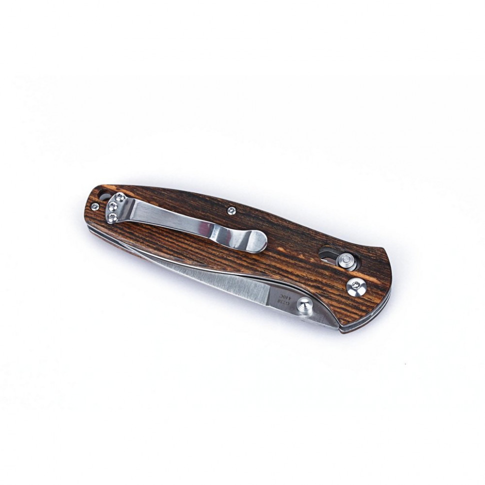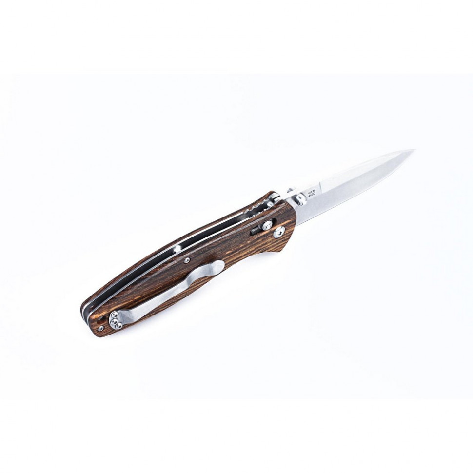 Чтобы выдержать эксплуатацию в таких жестких условиях, какие предполагает отдых на природе, нож должен быть собран из самых качественных комплектующих. Так, клинок Ganzo G738-W выпущен из нержавейки, которая нашла широкое применение в этой отрасли. Марка 440С содержит в составе целый ряд легирующих добавок, которые позволяют улучшить ее свойства, повысить стойкость к ржавлению и способность оставаться остро заточенной. Геометрия клинка грамотно продумана. Это drop point с пониженной линией обуха. Острие клинка немного приподнято, за счет чего режущая кромка фактически удлиняется. Заточка ножа ровная и ее легко подновить, используя самую обычную карманную точилку. Что касается габаритов клинка, то это длина 8,9 см, позволяющая легко использовать нож для чистки рыбы, приготовления бутербродов, и толщина 3,3 мм.