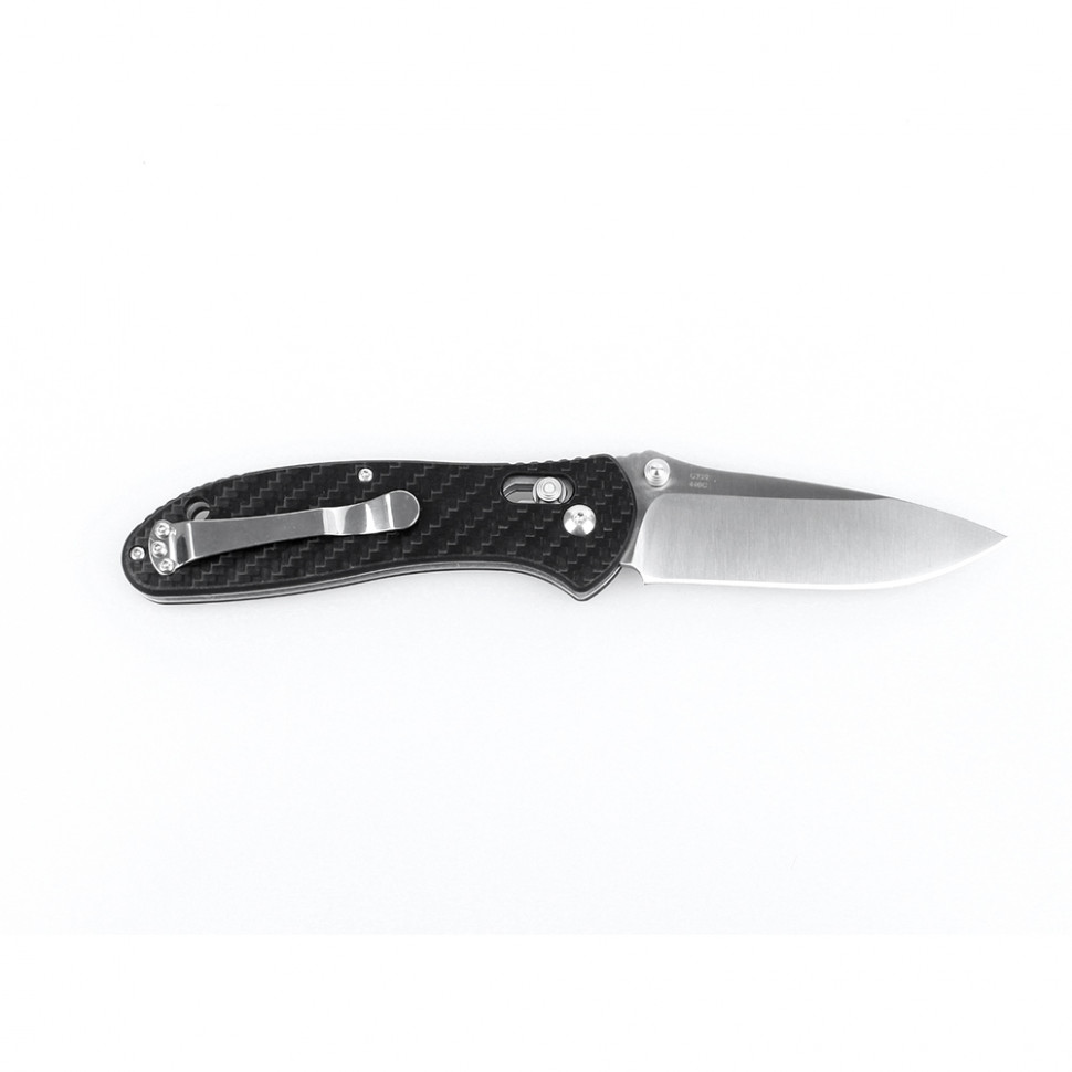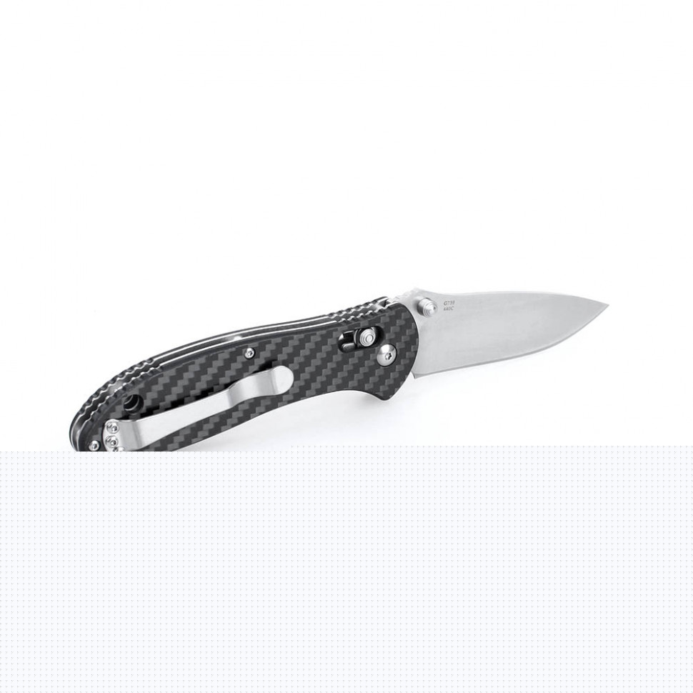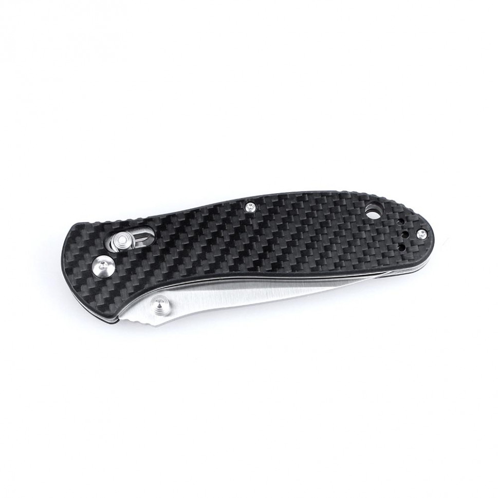 В данной модели для рукоятки сделаны карбоновые накладки. Этим объясняется плетеная фактура ручки. Преимуществом же выбранного материала является то, что он очень прочный и легкий. Ручка ножа из углеволокна не впитывает воду, не выгорает на солнце. Чтобы Ganzo G7391 было удобно использовать в качестве подручного ножа в любой ситуации, к его рукоятке прикреплена стальная клипса, за которую нож легко цепляется на пояс.