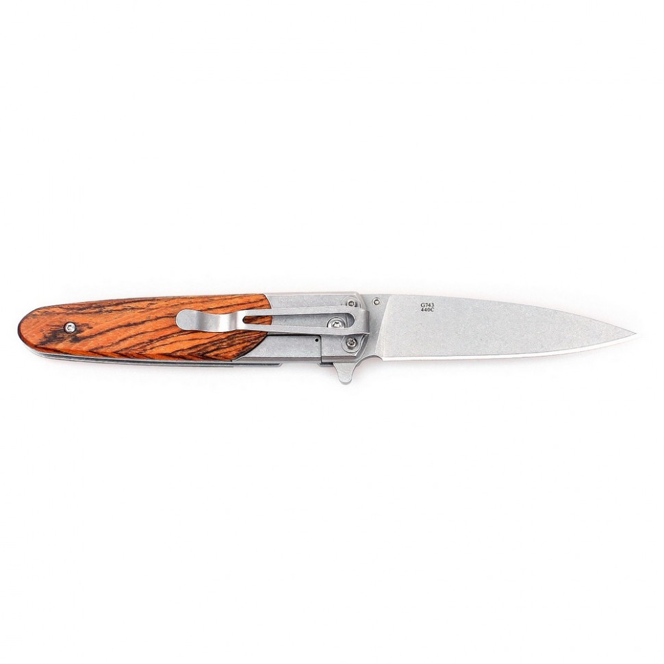 Нож складного типа — более компактный, чем фиксированный, а потому именно такие модели будут предпочтительными в повседневном использовании или поездках для отдыха на природу. G743-2-WD1 принадлежит именно к такому типу ножей и является очень практичным представителем семейства складных клинков. Для этого ножа используются исключительно долговечные качественные материалы, а все его детали выполнены с большой точностью. В качестве материала для лезвия производители использовали сталь 440С. Это хорошо сбалансированная нержавейка, которая требует самого простого ухода, чтобы оставаться в хорошем рабочем состоянии. Заточен нож универсальным способом — прямо. Это позволяет выполнять с его помощью почти весь спектр работ, который вообще адресован ножам. Длины клинка, равной 87 мм, также вполне достаточно, чтобы все действия по нарезке и разрезанию чего-либо было выполнять удобно. Поверхность ножа отшлифована достаточно интересным способом — галтовкой. Эта обработка отличается от других тем, что в результате, металл становится почти полностью матовым, а на вид его структура кажется неоднородной. Тем не менее, клинок ножа — полностью гладкий, а его коррозийная стойкость ничуть не снижается.