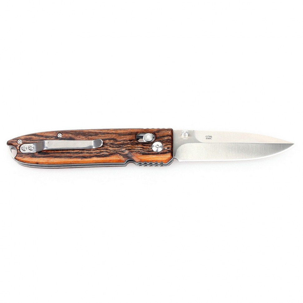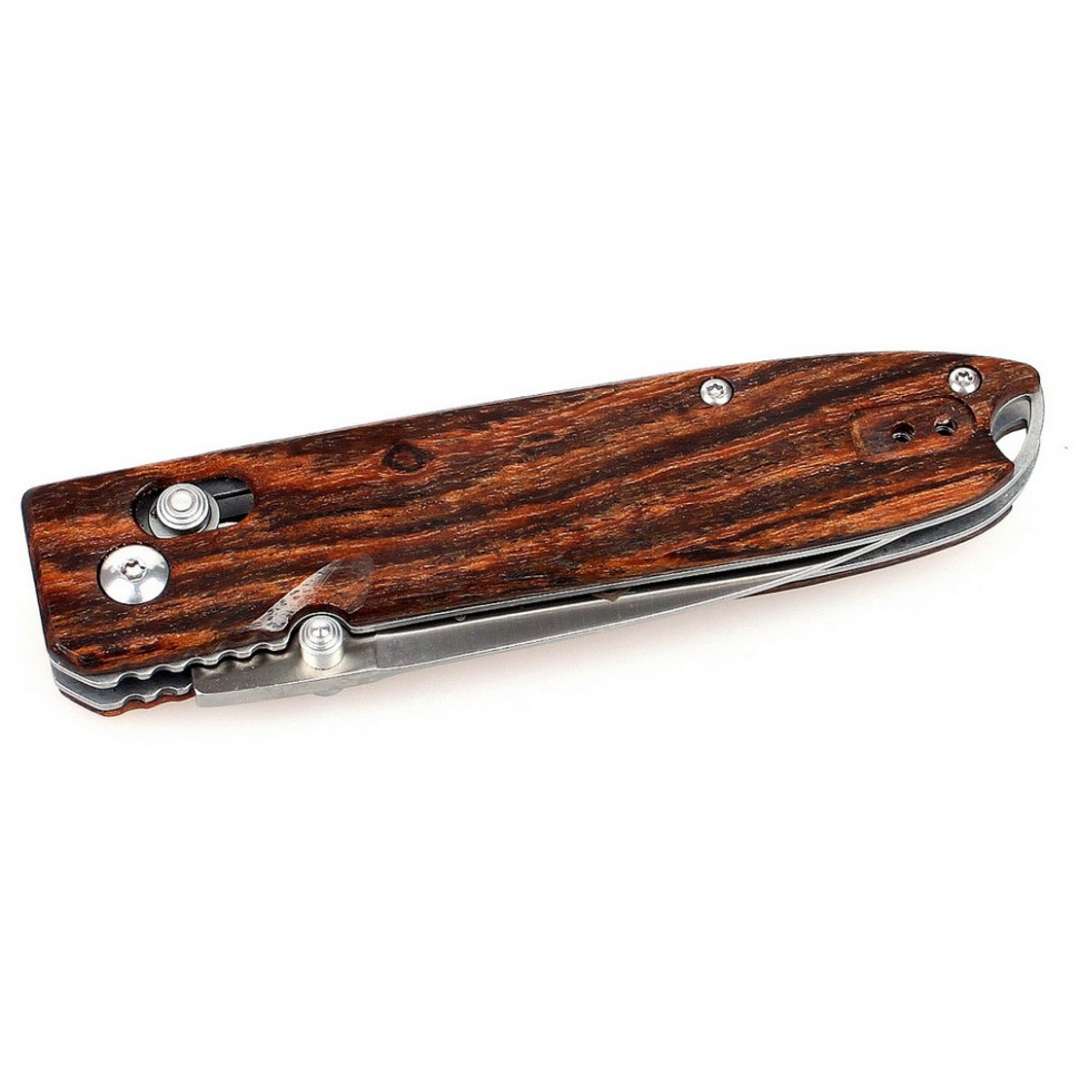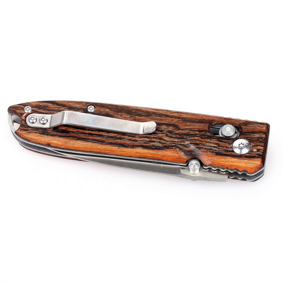 Рукоятка этого складного ножа изготовлена из дерева. Его сорт производители не уточняют, но известно, что накладки хорошо обработаны и пропитаны особым составом, чтобы не впитывать воду и быть как можно более долговечными. К ручке ножа прикручена клипса, которую при желании можно переставить на обратную сторону.