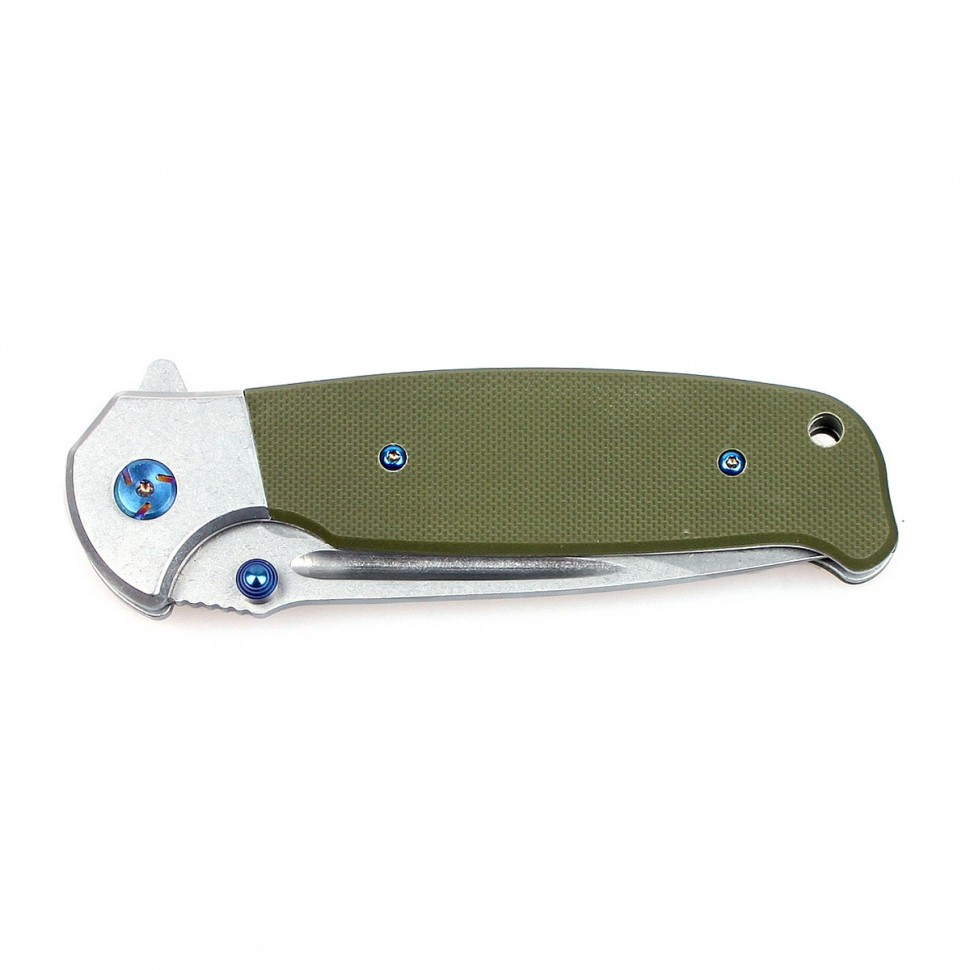 Для оформления рукоятки из материала G10 сделаны две накладки. Они прикручиваются винтами с обеих сторон стальной основы. Поверхность накладок — неровная, чтобы они не скользили даже в том случае, если рука в перчатке. Покупатели могут приобрести нож с оранжевой, черной или болотно-зеленой рукояткой. На накладках также предусмотрено место для клипсы, если владельцу ножа захочется переставить ее в другое положение. Сама же клипса прикручена к стальной части ручки, которая расположена ближе к клинку.