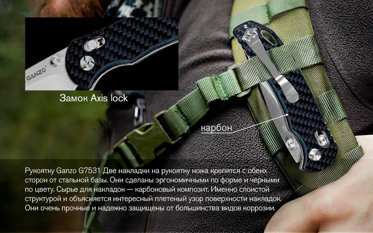 В открытом состоянии лезвие ножа Ganzo G7531-CF блокируется современным замком Axis. Это надежный по конструкции фиксатор, который позволяет удобно пользоваться ножом даже в ситуациях, когда свободна только одна рука.