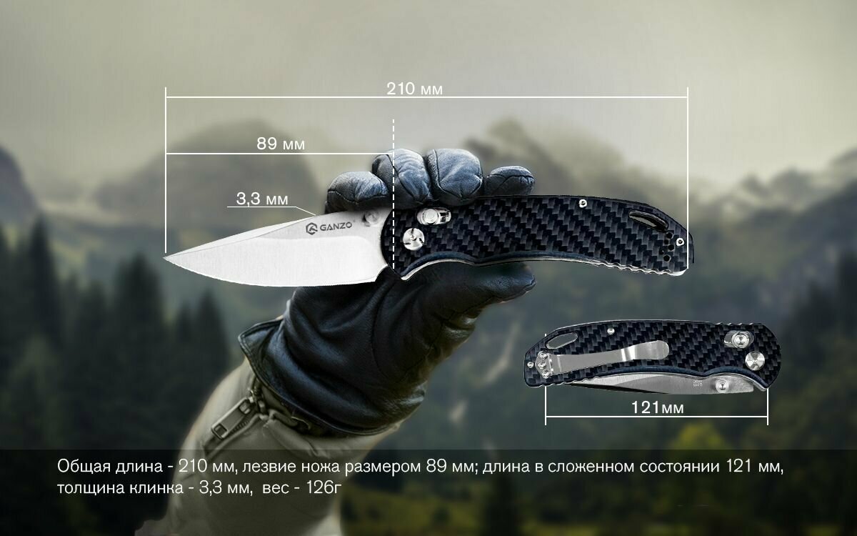 Нож Ganzo G7531-CF получил все необходимые качества, чтобы стать верным спутником любому путешественнику. О не ржавеет в случае использования в сырости. Для этого была выбрана сталь 440С, принадлежащая к числу стойких к коррозии сплавов. Она отлично противостоит ржавлению и другим проявлениям коррозии. В то же время, этот сплав закаливается до твердости 58HRC. Это позволяет ножу в течение длительного периода оставаться острым. Уход за клинком из этого металла потребуется самый минимальный. Габариты лезвия тоже универсальны. Это 89 мм в длину, 3,3 мм по толщине. Форма клинка — clip-point. Нож Ganzo G7531-CF получил гладкую заточку, которая среди всех видов считается классической и одной из самых универсальных. Еще один важный момент — это финишная обработка клинка. На нем видны небольшие поперечные царапинки, оставленные абразивом. Они не снижают качества стали, но легко маскируют мелкие потертости. Такой штриховой узор характерен для обработки сатинированием.