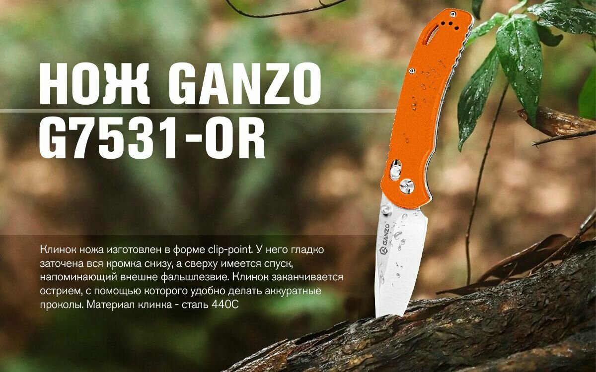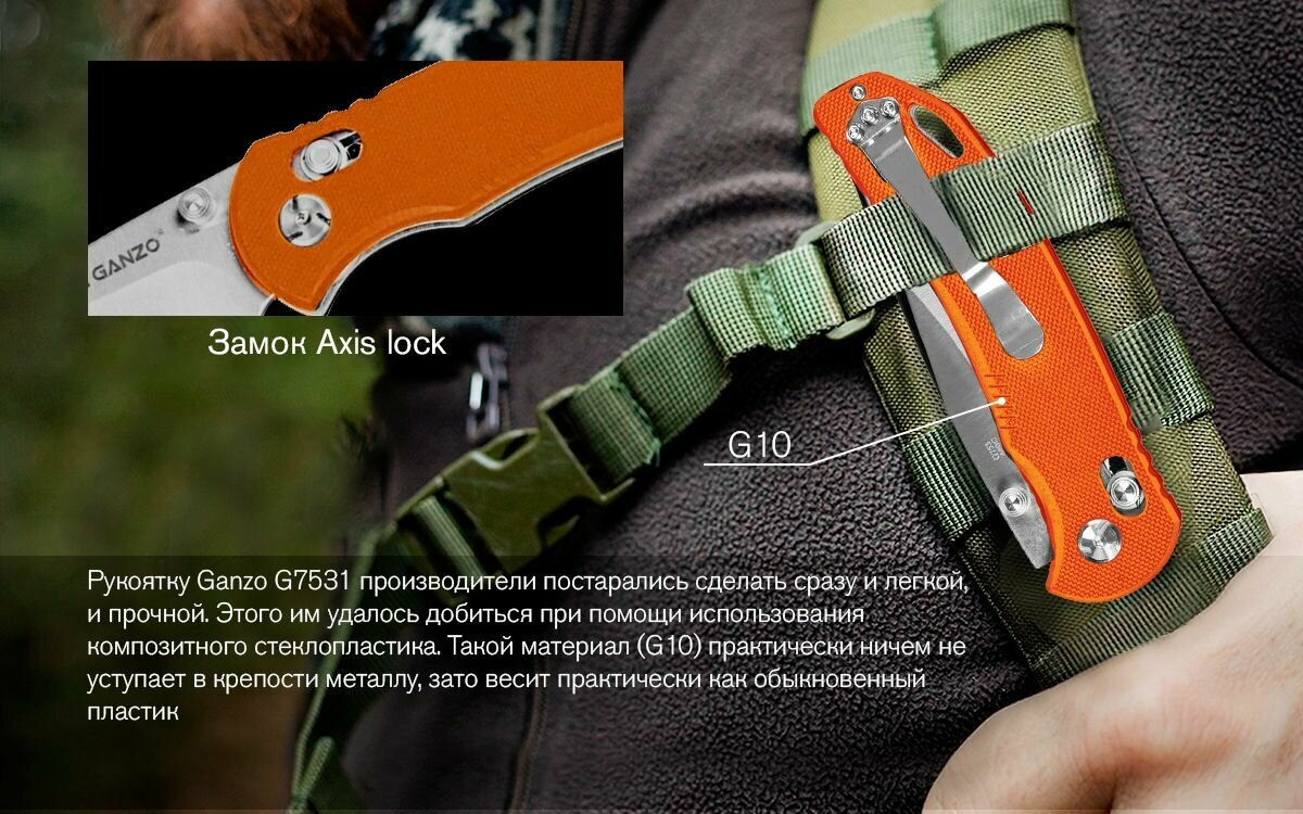 Нож Ganzo G7531 изготовлен таким образом, чтобы удовлетворить запросы сразу большого числа покупателей. Он подходит для всех видов туризма и других разновидностей активности на природе. Его так же успешно можно использовать и в городе. Данная модель сделана складной, что существенно облегчает ее перевозку. Более того, встроенный в нож замок, надежно блокирует ход лезвия по оси, чтобы оно не могло перемещаться самостоятельно при использовании ножа. В данном случае, это замок Axis, позволяющий легко открывать нож в случае надобности одной рукой.