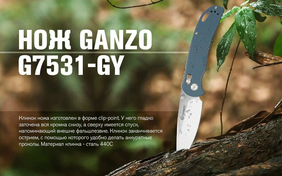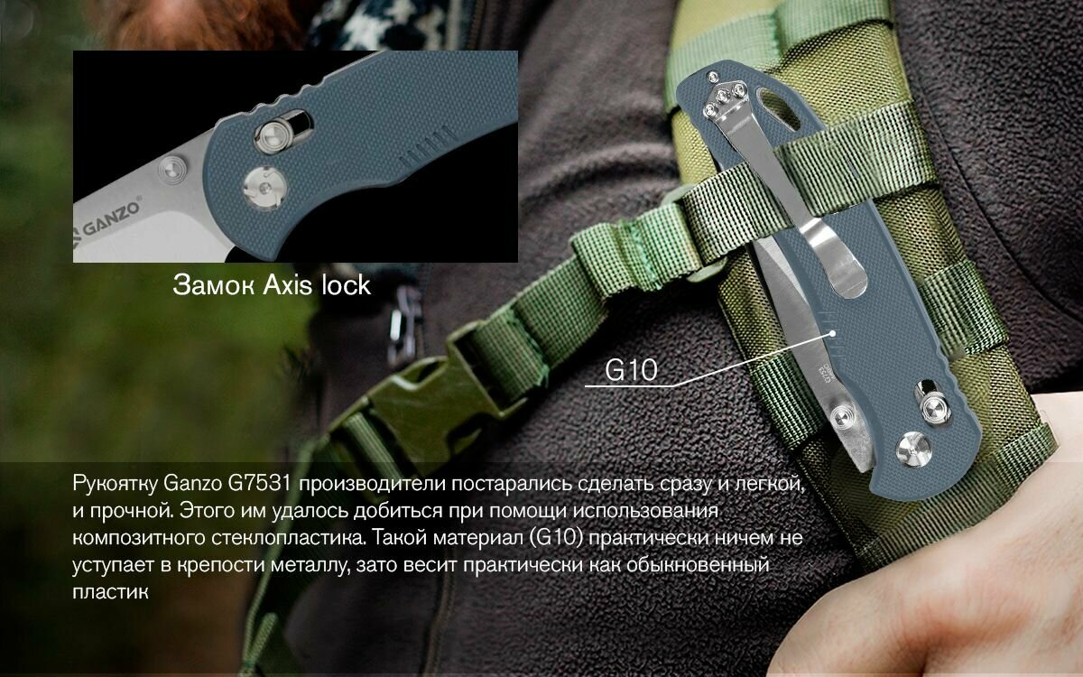 Нож Ganzo G7531 изготовлен таким образом, чтобы удовлетворить запросы сразу большого числа покупателей. Он подходит для всех видов туризма и других разновидностей активности на природе. Его так же успешно можно использовать и в городе. Данная модель сделана складной, что существенно облегчает ее перевозку. Более того, встроенный в нож замок, надежно блокирует ход лезвия по оси, чтобы оно не могло перемещаться самостоятельно при использовании ножа. В данном случае, это замок Axis, позволяющий легко открывать нож в случае надобности одной рукой.