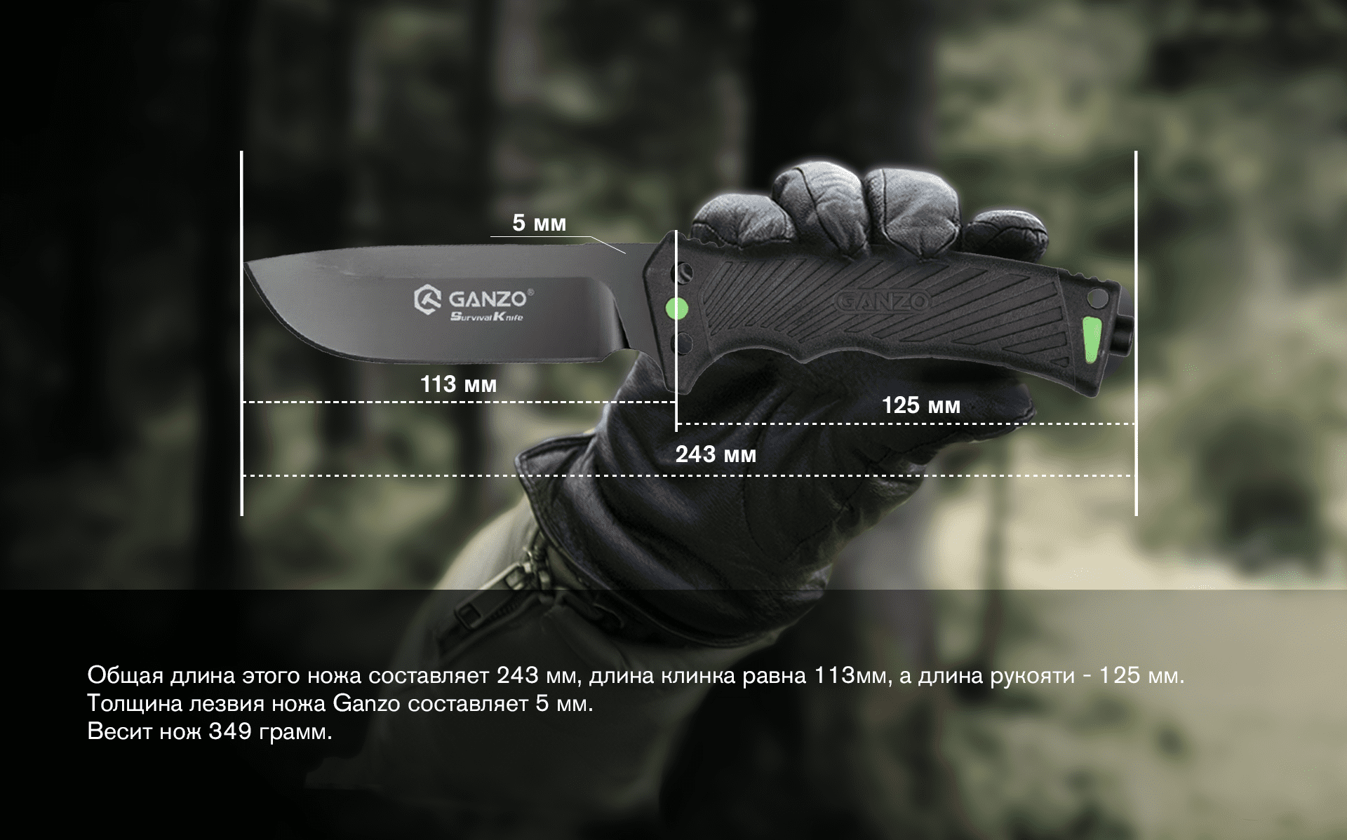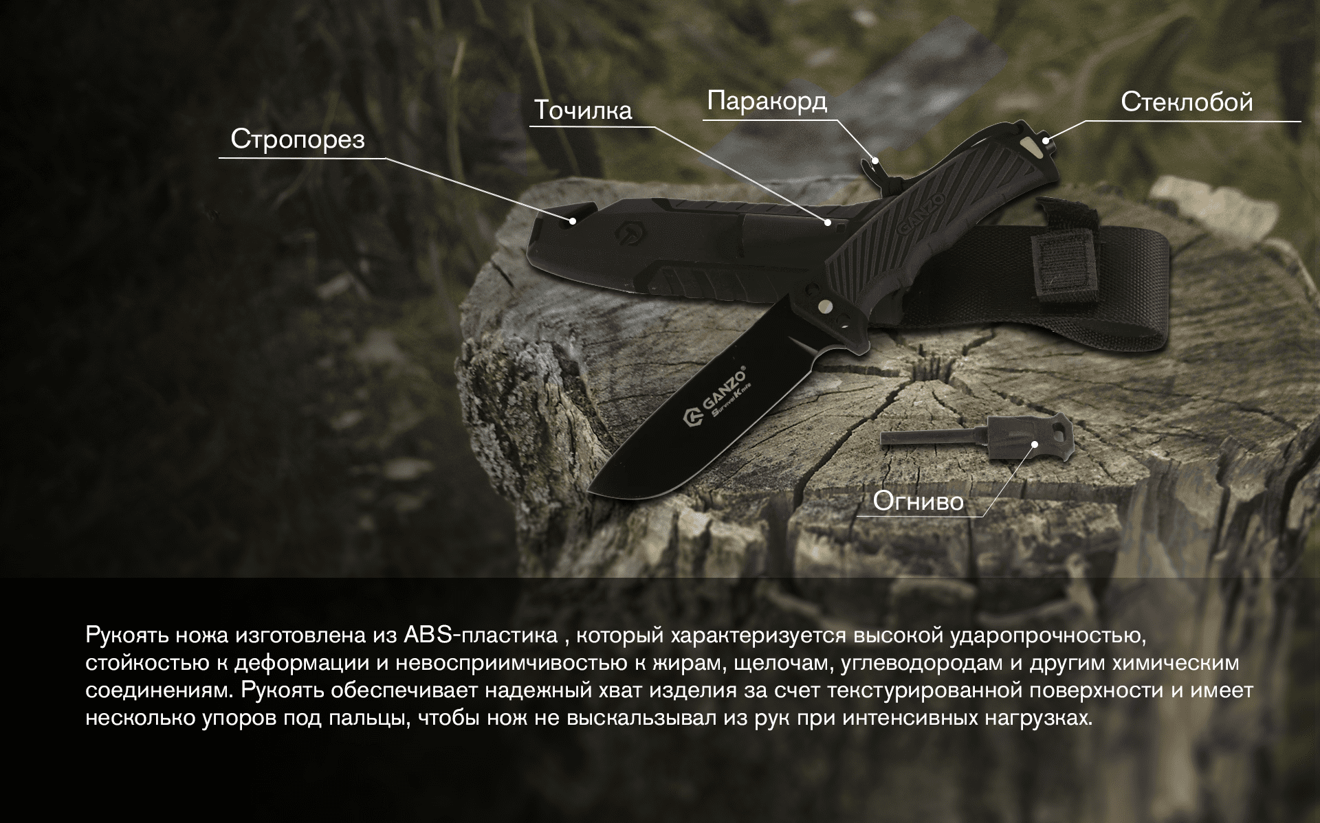 Поскольку нож Ganzo G8012V2-BK создавался специально для нужд путешественников-экстремалов, производитель оснастил его эргономичной рукоятью, которая легко помещается в ладонь любого размера. Выемка для упора под палец делает хват более надежным и позволяет удерживать инструмент даже во влажной руке. Материал рукояти — ABS-пластик, который ценится в ножевой промышленности за ударопрочность и невосприимчивость к воздействию кислот, бензина и других химических веществ без потери свойств и цвета.