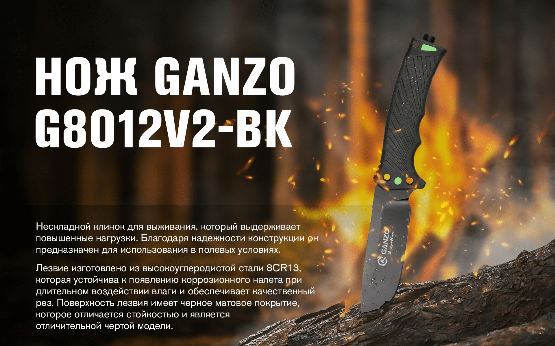 Производитель позиционирует модель Ganzo G8012V2-BK как нож выживальщика, поскольку она имеет усиленную конструкцию, которая выдерживает экстремально высокие нагрузки. Инструмент относится к нескладному типу ножей. Клинок переносится и хранится в специальных ножнах, которые обладают рядом дополнительных функций.