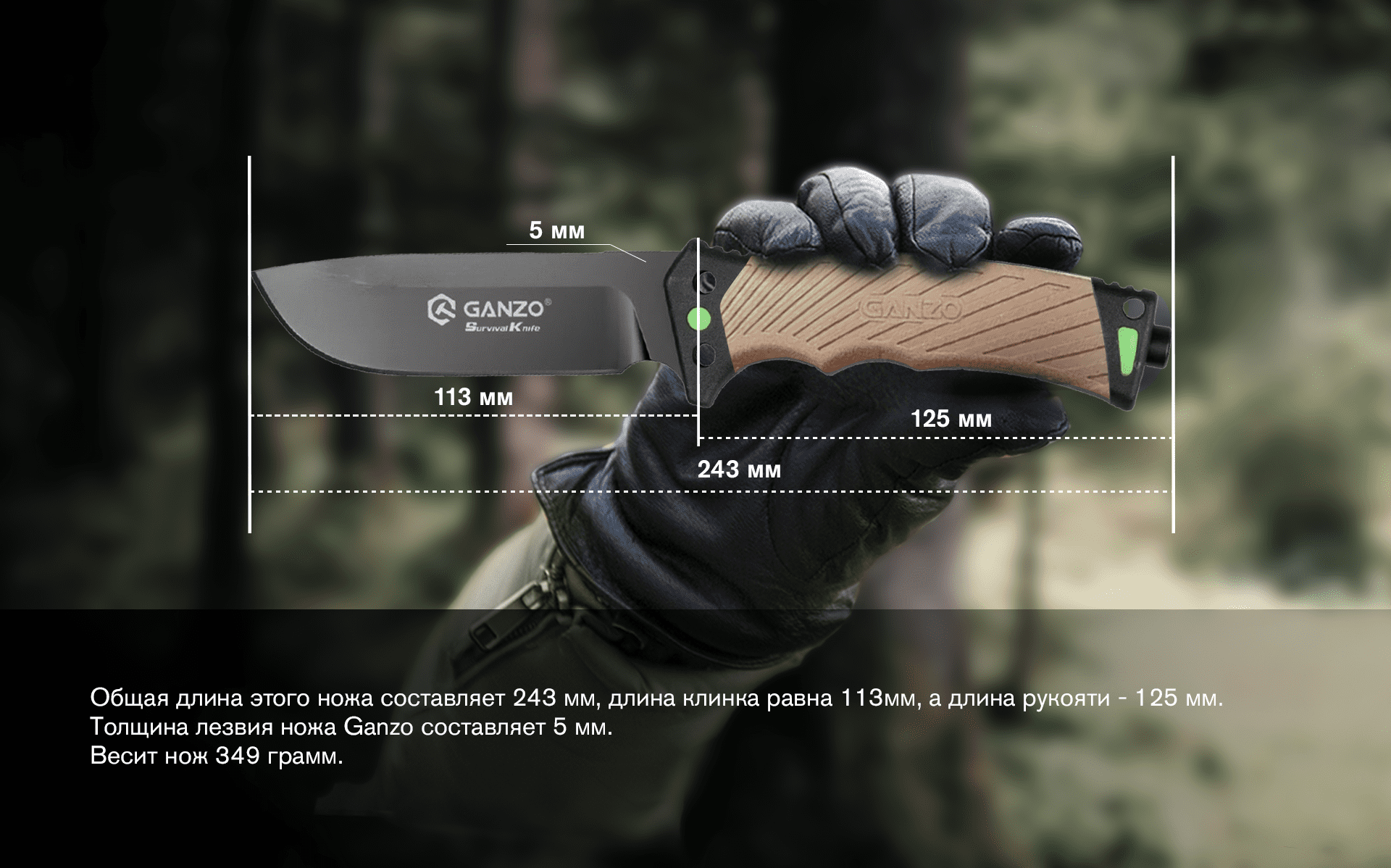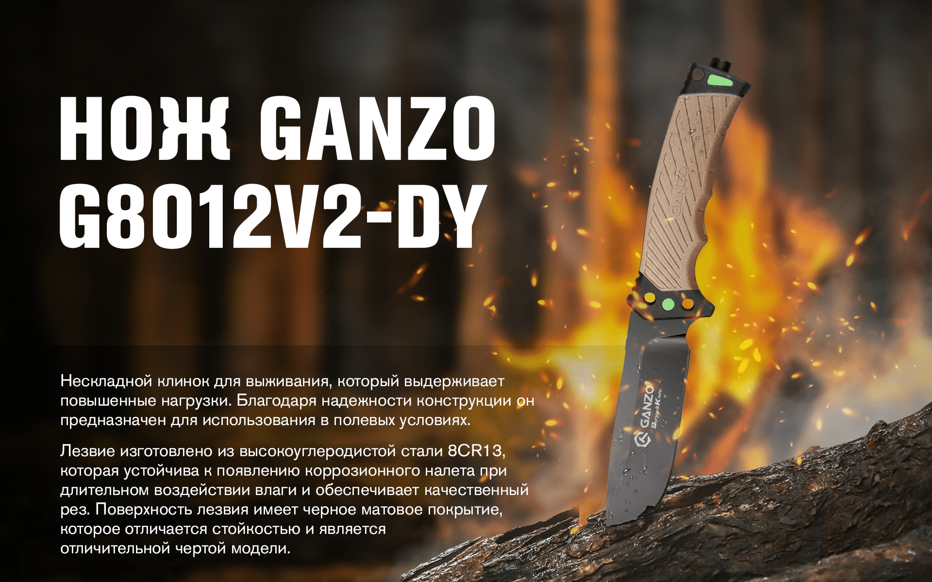 Производитель позиционирует модель Ganzo G8012V2-DY как нож выживальщика, поскольку она имеет усиленную конструкцию, которая выдерживает экстремально высокие нагрузки. Инструмент относится к нескладному типу ножей. Клинок переносится и хранится в специальных ножнах, которые обладают рядом дополнительных функций.