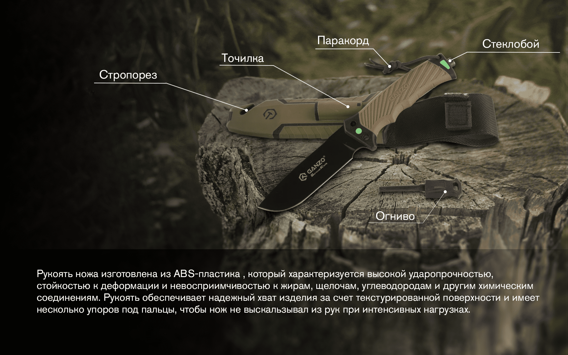 Поскольку нож Ganzo G8012V2-DY создавался специально для нужд путешественников-экстремалов, производитель оснастил его эргономичной рукоятью, которая легко помещается в ладонь любого размера. Выемка для упора под палец делает хват более надежным и позволяет удерживать инструмент даже во влажной руке. Материал рукояти — ABS-пластик, который ценится в ножевой промышленности за ударопрочность и невосприимчивость к воздействию кислот, бензина и других химических веществ без потери свойств и цвета.
