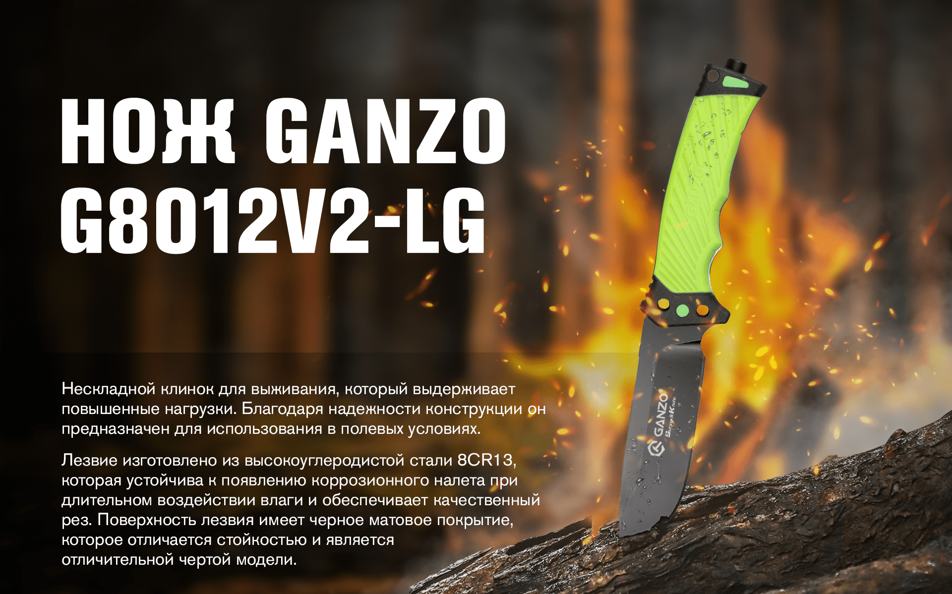 Производитель позиционирует модель Ganzo G8012V2-LG как нож выживальщика, поскольку она имеет усиленную конструкцию, которая выдерживает экстремально высокие нагрузки. Инструмент относится к нескладному типу ножей. Клинок переносится и хранится в специальных ножнах, которые обладают рядом дополнительных функций.