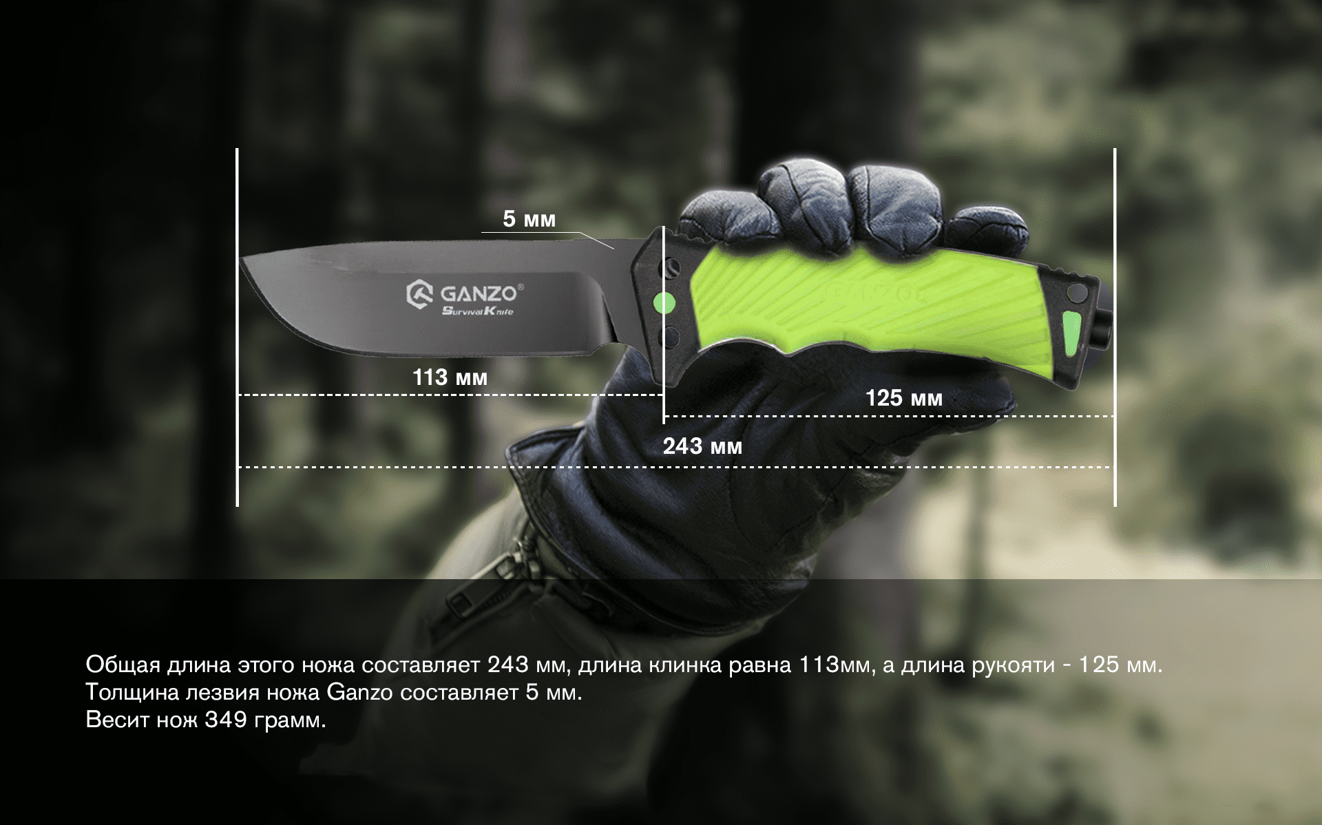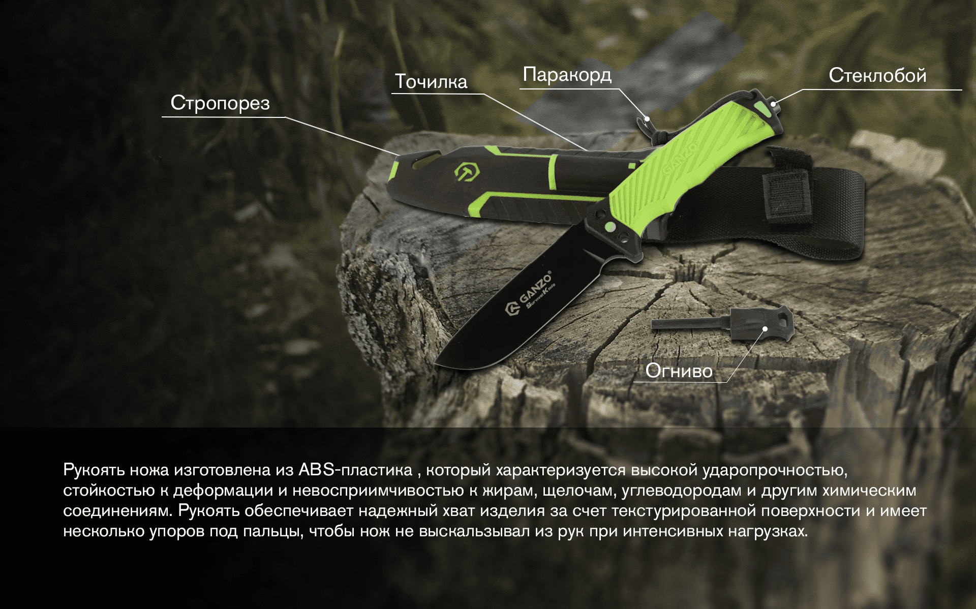 Поскольку нож Ganzo G8012V2-LG создавался специально для нужд путешественников-экстремалов, производитель оснастил его эргономичной рукоятью, которая легко помещается в ладонь любого размера. Выемка для упора под палец делает хват более надежным и позволяет удерживать инструмент даже во влажной руке. Материал рукояти — ABS-пластик, который ценится в ножевой промышленности за ударопрочность и невосприимчивость к воздействию кислот, бензина и других химических веществ без потери свойств и цвета.