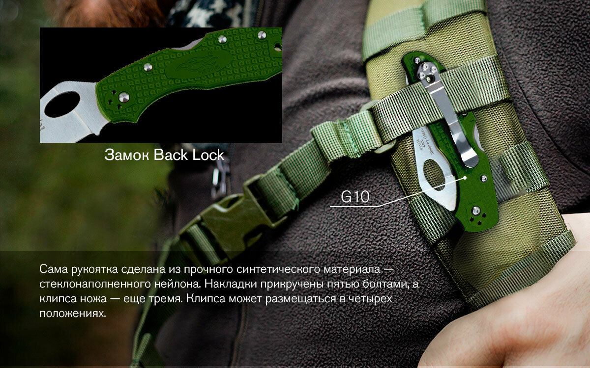 Сама рукоятка сделана из прочного синтетического материала — стеклонаполненного нейлона. Накладки прикручены пятью болтами, а клипса ножа — еще тремя. Клипса может размещаться в четырех положениях. Цвет рукоятки покупатель может выбрать из нескольких доступных вариантов: черный, оранжевый, розовый и голубой.