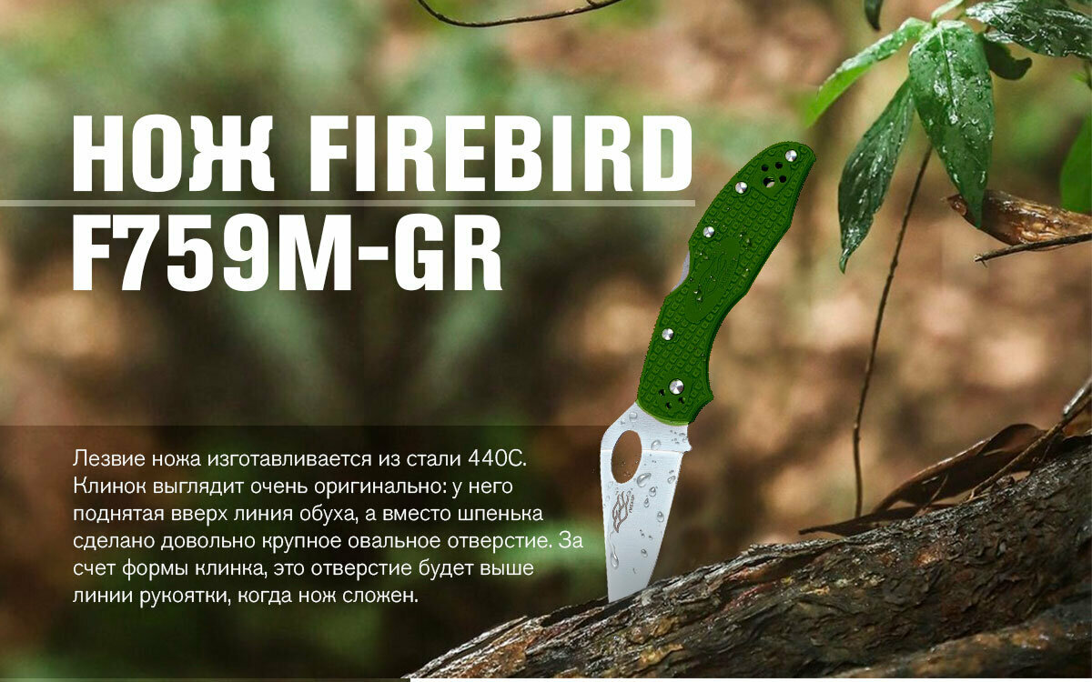 Ножи Firebird F759M предназначаются для повседневного использования, как компактный подручный инструмент. Учитывая, что пользователь может носить их с собою буквально всюду, производители сделали данную модель не только практичной, но и очень оригинальной в отношении дизайна. Размер ножа — под небольшую руку, но работать с ним вполне удобно.