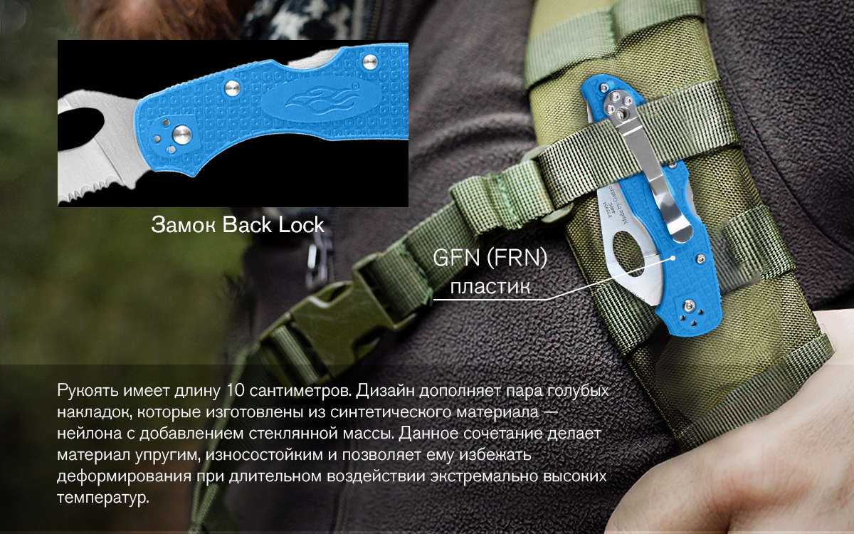 Нож оснащен изящным клинком длиной 75 миллиметров и толщиной 2.8 миллиметров. В нем присутствует овальное отверстие, которое не только способствует снижению общего веса конструкции до 67 грамм, но и облегчает раскрытие инструмента. Для этого необходимо вставить палец в отверстие и раскрыть клинок до фиксации. Клинок удерживается в открытом положении за счет замка Back Lock — простого в эксплуатации механизма с подпружиненным рычагом.