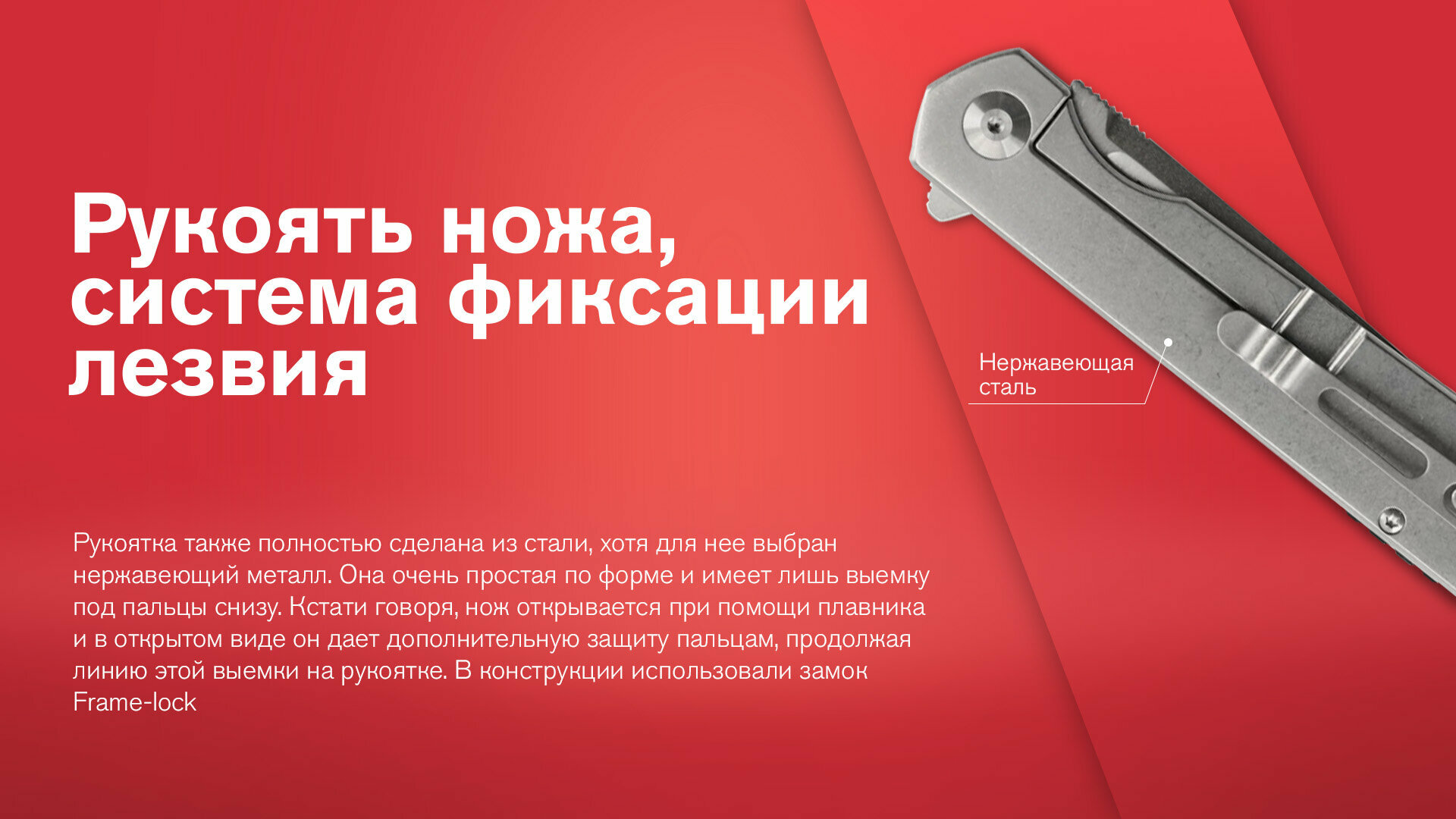 Рукоятка также полностью сделана из стали, хотя для нее выбран нержавеющий металл. Она очень простая по форме и имеет лишь выемку под пальцы снизу. Кстати говоря, нож открывается при помощи плавника и в открытом виде он дает дополнительную защиту пальцам, продолжая линию этой выемки на рукоятке. Также на ручке ножа прикручена стальная клипса, которую легко можно переставить на другую сторону.