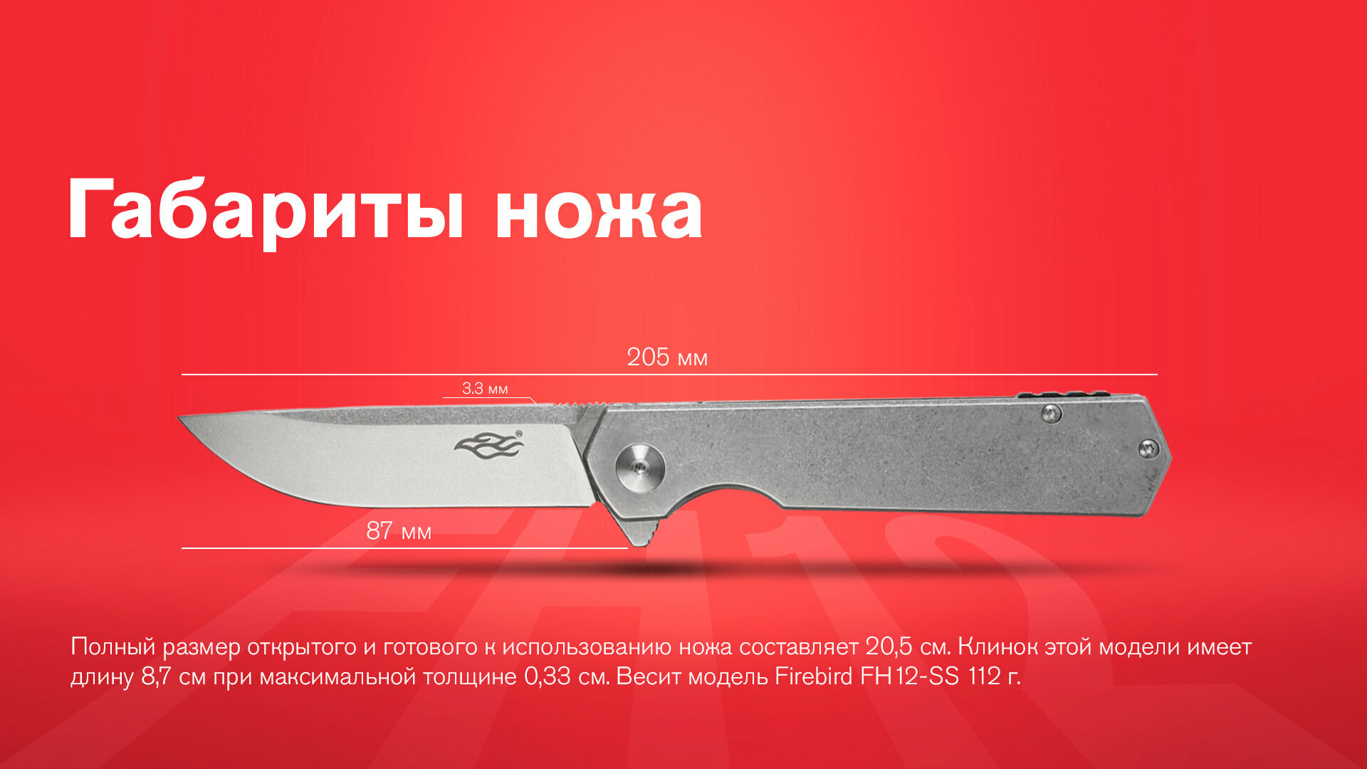 Полный размер открытого и готового к использованию ножа составляет 20,5 см. Весит модель Firebird FH12-SS 112 г.