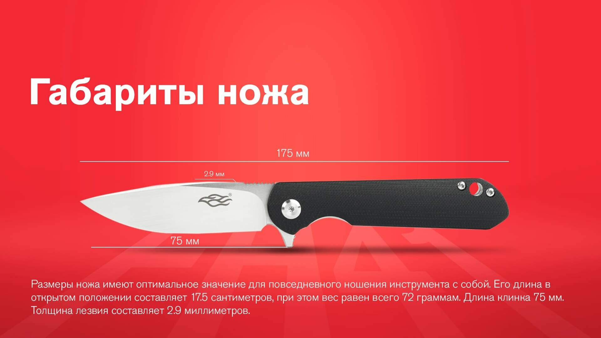 Поскольку складной нож Ganzo FH41S-BK относится к типу EDC-моделей, его вес был максимально облегчен для комфортного ношения инструмента с собой. При общей длине в 17.5 сантиметров вес изделия составляет всего 72 грамма, которые практически не ощущаются в руке.