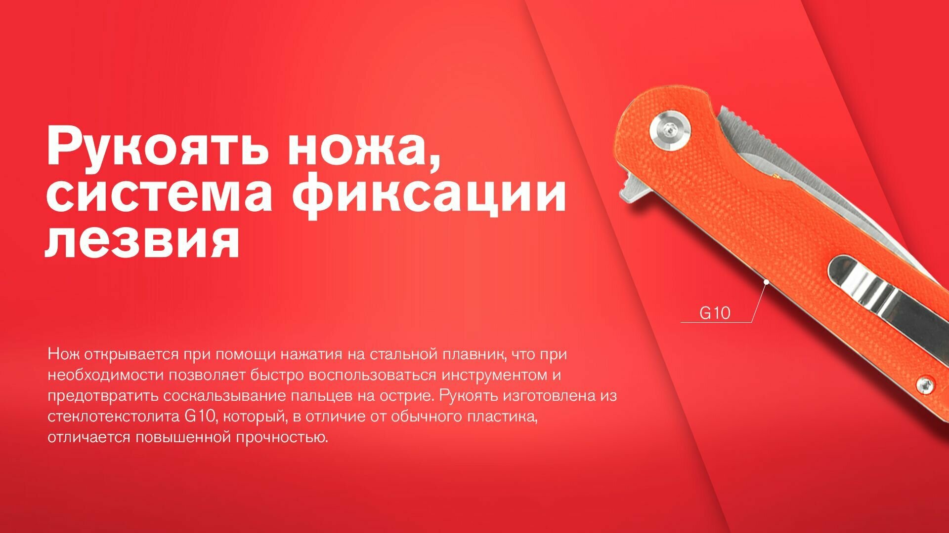 Накладки из композитного материала G10 гарантируют, что клинок останется невредимым даже при падении с высоты и контакте с кислотами. Стеклотекстолит обладает высокой прочностью, не трескается и не деформируется под воздействием экстремальных температур и надолго сохраняет насыщенный цвет, в том числе при длительном воздействии ультрафиолетовых лучей. Шероховатая поверхность накладок создает противоскользящую поверхность, благодаря чему инструмент не выскальзывает из влажных рук.