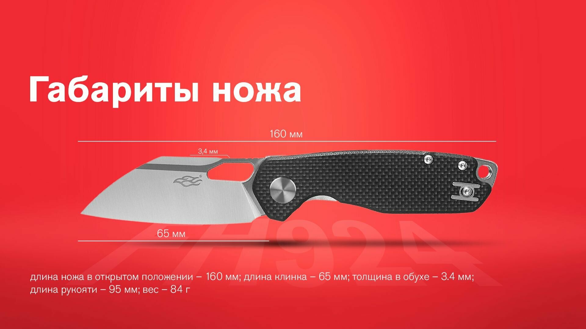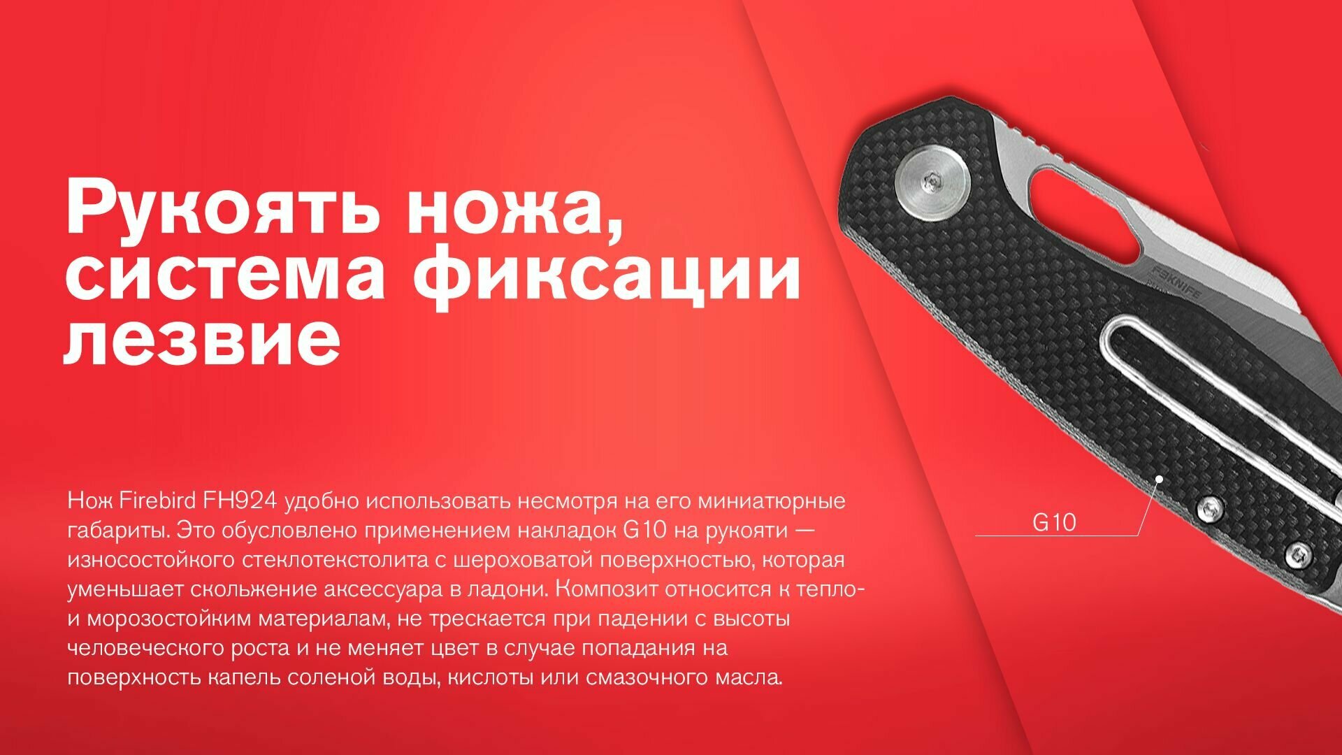 Нож Firebird FH924 удобно использовать несмотря на его миниатюрные габариты, составляющие 16 см в раскрытом положении. Это обусловлено применением накладок G10 на рукояти — износостойкого стеклотекстолита с шероховатой поверхностью, которая уменьшает скольжение аксессуара в ладони. Композит относится к тепло- и морозостойким материалам, не трескается при падении с высоты человеческого роста и не меняет цвет в случае попадания на поверхность капель соленой воды, кислоты или смазочного масла.