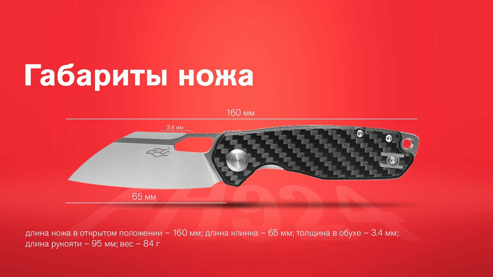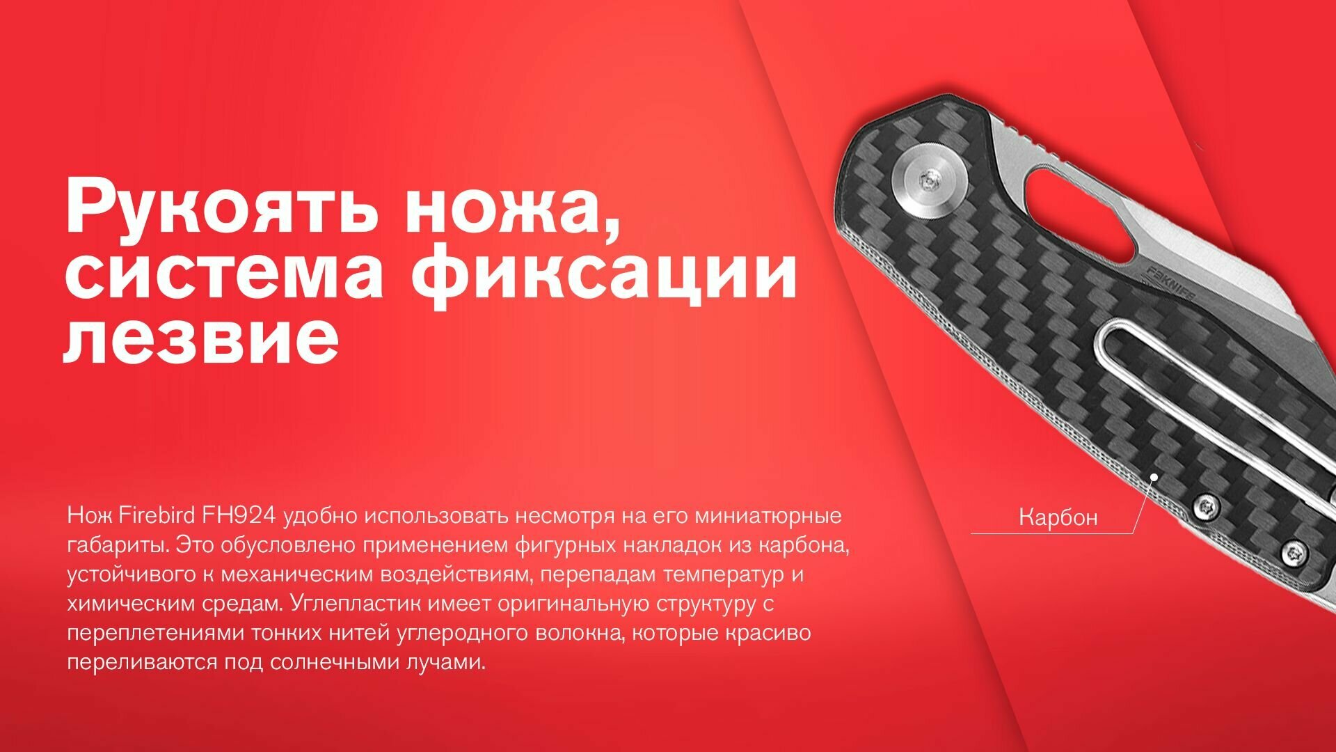 Нож Firebird FH924 удобно использовать несмотря на его миниатюрные габариты, составляющие 16 см в раскрытом положении. Это обусловлено применением фигурных накладок из карбона, устойчивого к механическим воздействиям, перепадам температур и химическим средам. Углепластик имеет оригинальную структуру с переплетениями тонких нитей углеродного волокна, которые красиво переливаются под солнечными лучами.