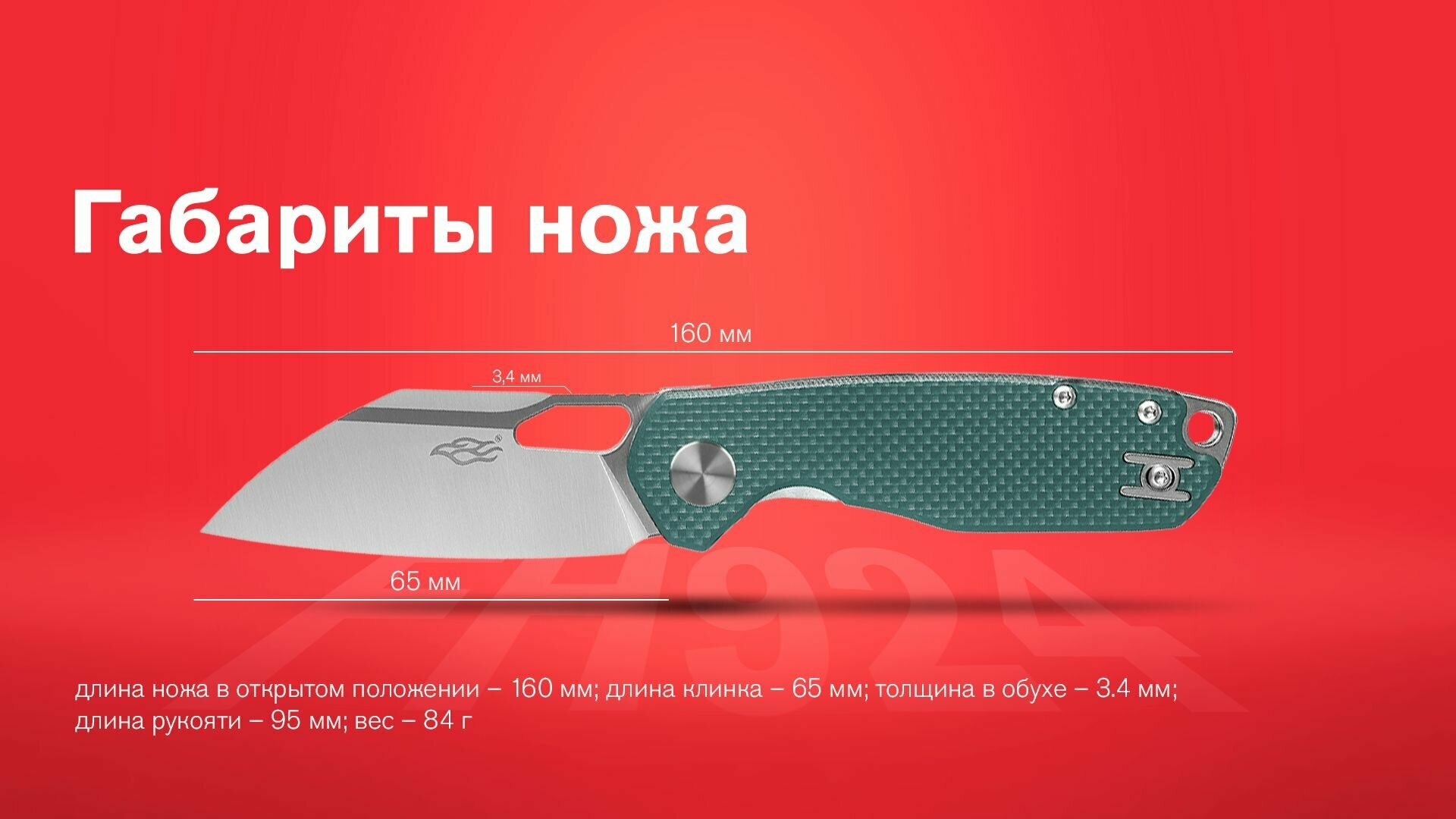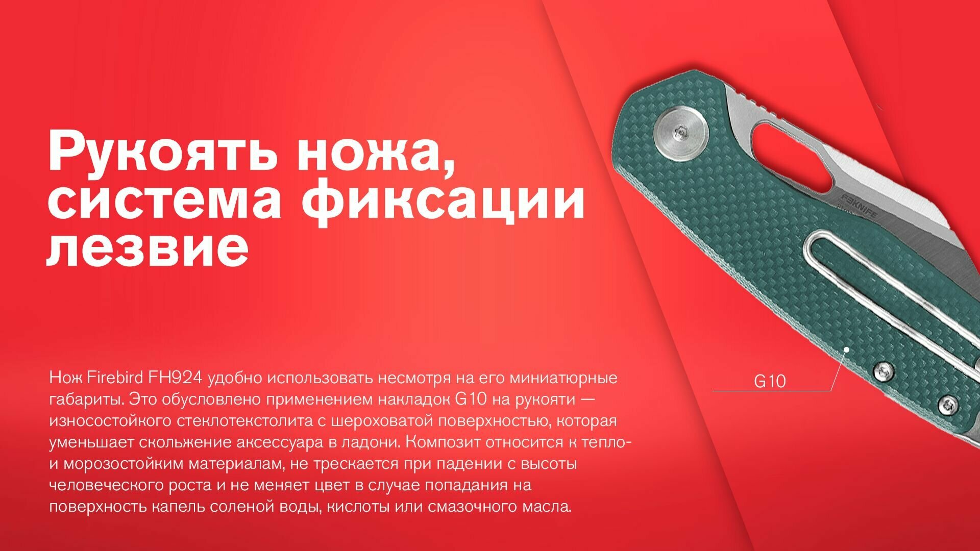 Нож Firebird FH924 удобно использовать несмотря на его миниатюрные габариты, составляющие 16 см в раскрытом положении. Это обусловлено применением накладок G10 на рукояти — износостойкого стеклотекстолита с шероховатой поверхностью, которая уменьшает скольжение аксессуара в ладони. Композит относится к тепло- и морозостойким материалам, не трескается при падении с высоты человеческого роста и не меняет цвет в случае попадания на поверхность капель соленой воды, кислоты или смазочного масла.