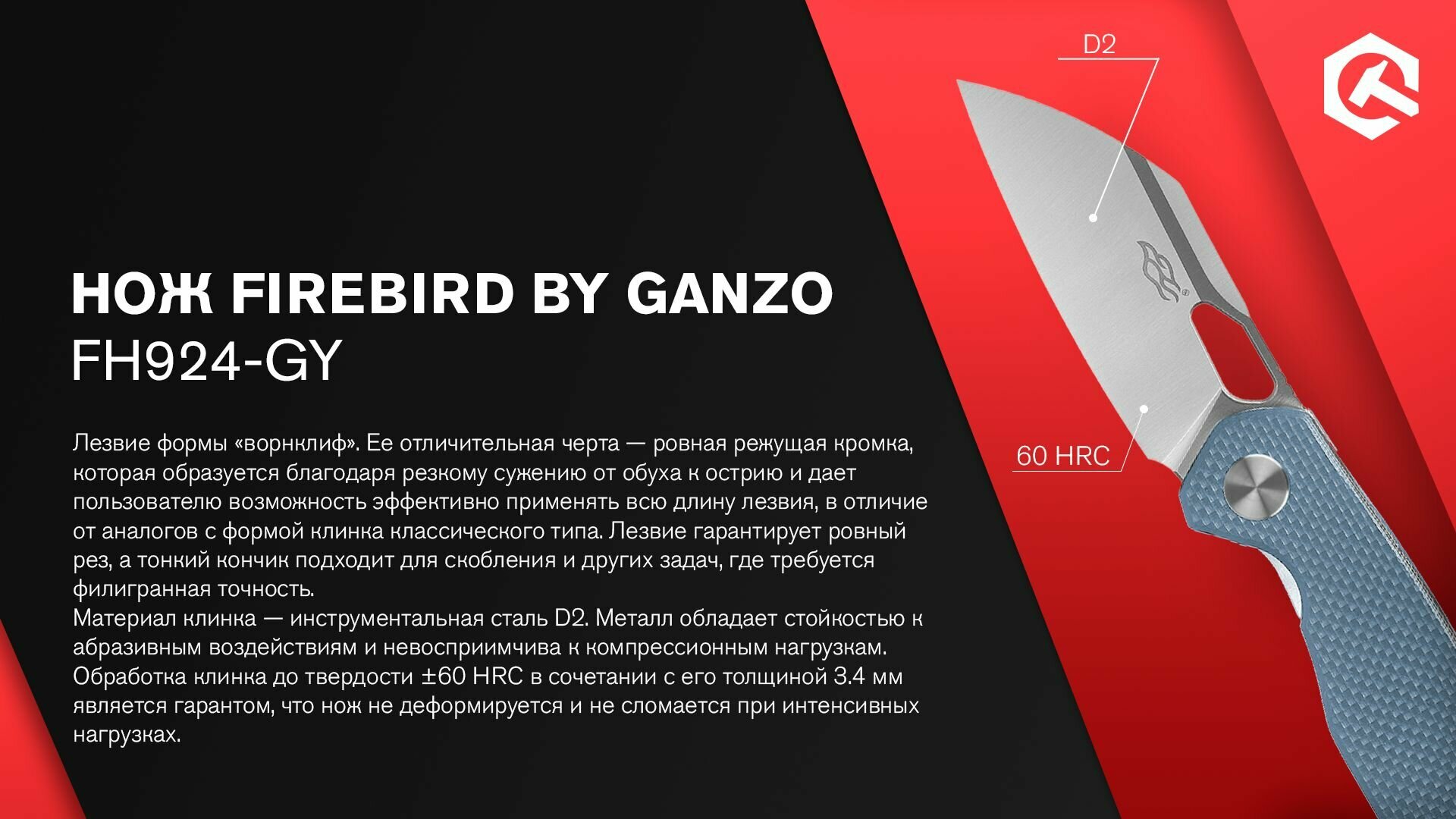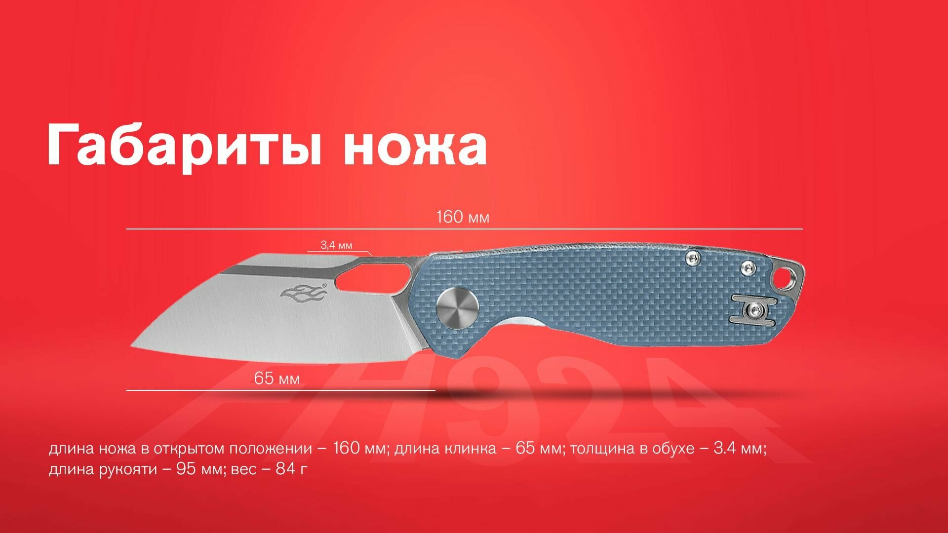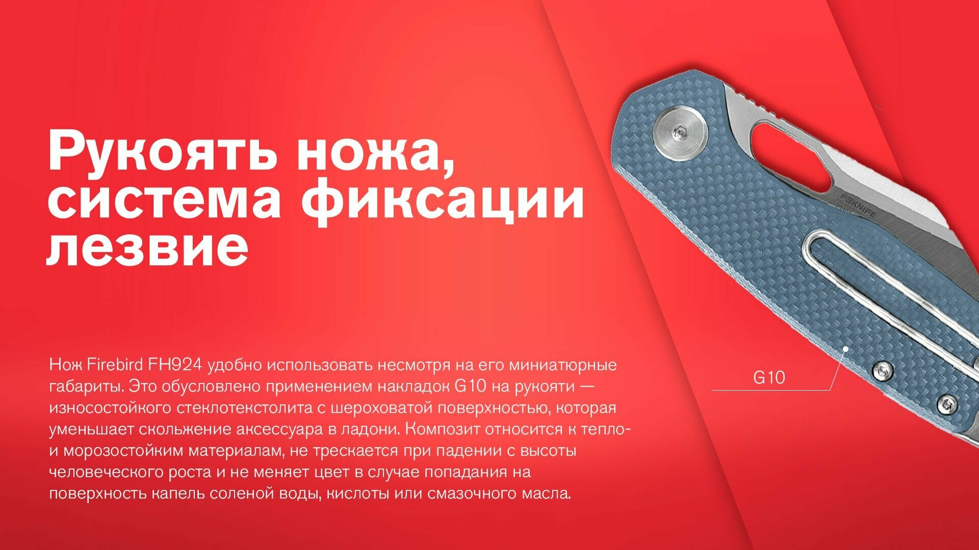Нож Firebird FH924 удобно использовать несмотря на его миниатюрные габариты, составляющие 16 см в раскрытом положении. Это обусловлено применением накладок G10 на рукояти — износостойкого стеклотекстолита с шероховатой поверхностью, которая уменьшает скольжение аксессуара в ладони. Композит относится к тепло- и морозостойким материалам, не трескается при падении с высоты человеческого роста и не меняет цвет в случае попадания на поверхность капель соленой воды, кислоты или смазочного масла.