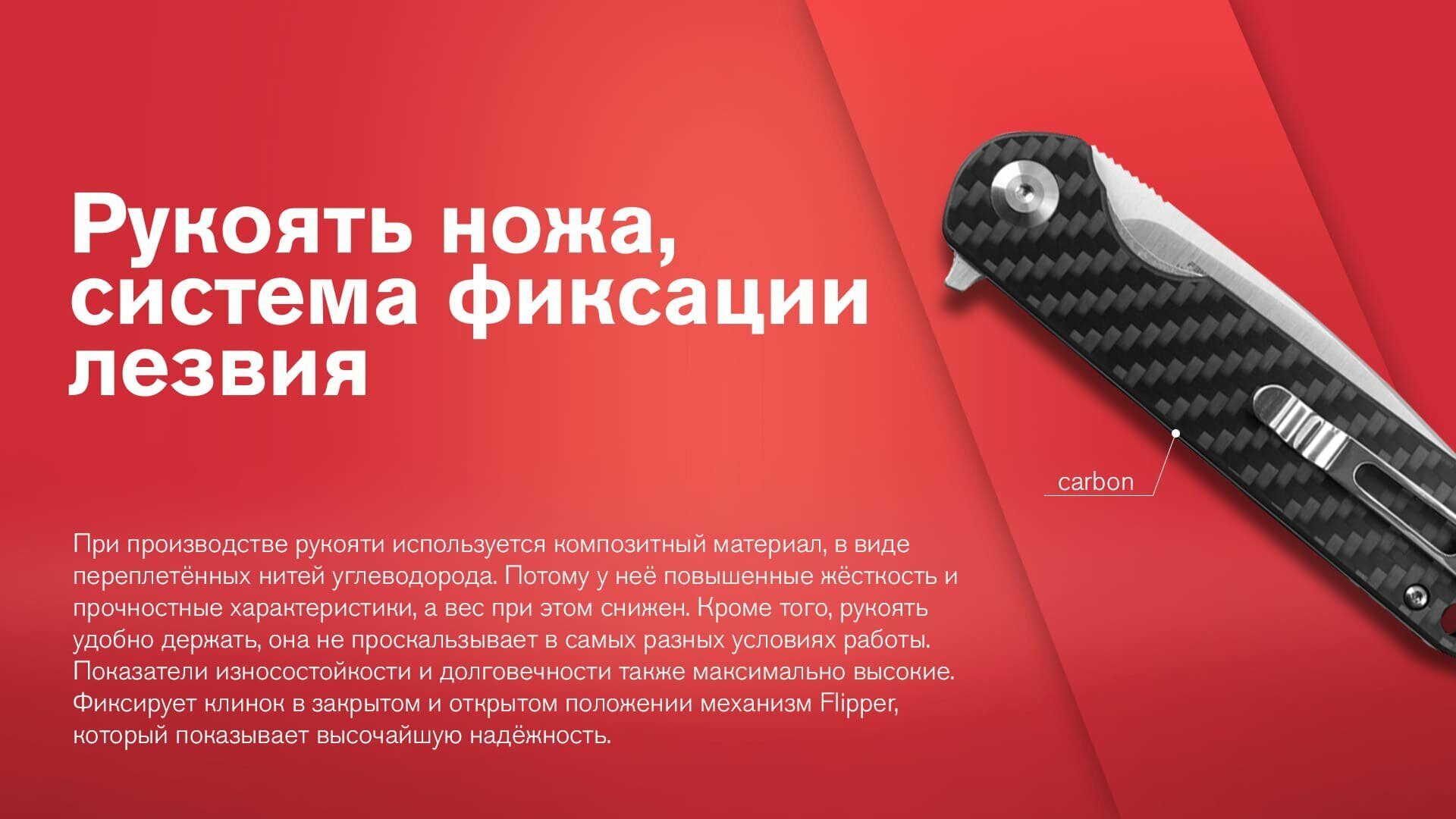 Нож FH41-CF сразу понравился всем, как только появился на рынке. Он универсален и прочен, производитель продумал каждую мелочь. Форма клинка классическая – drop-point, с приспущенным к острию обухом. Изготавливается он из высококачественной стали D2 с твёрдостью 60 HRC. Тип открывания ножа – Flipper, показывающий высокую надежность.