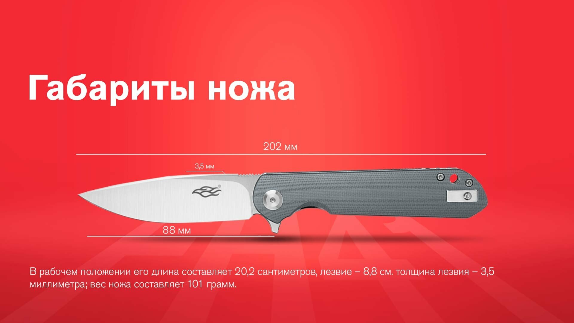 FH41 от Firebird стильно выглядит, но при этом практически идеально сбалансирован. В рабочем положении его длина составляет 20,2 сантиметров, лезвие – 8,8 см.
