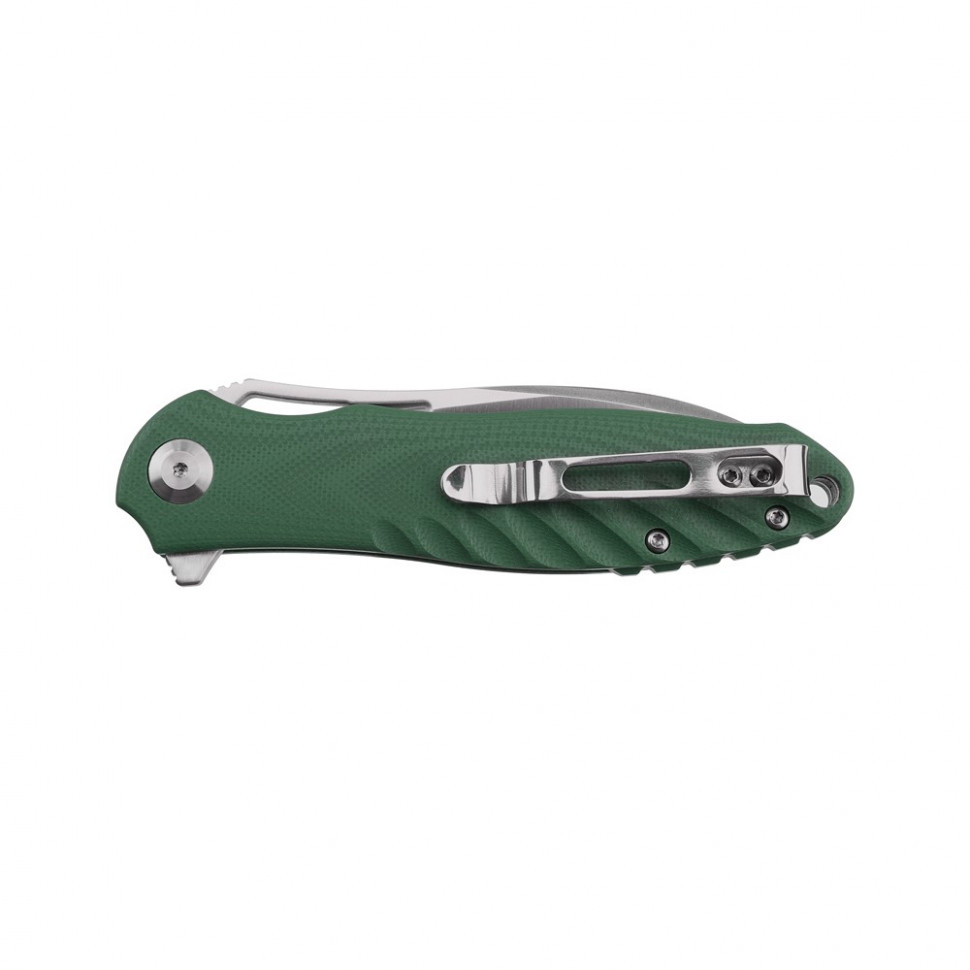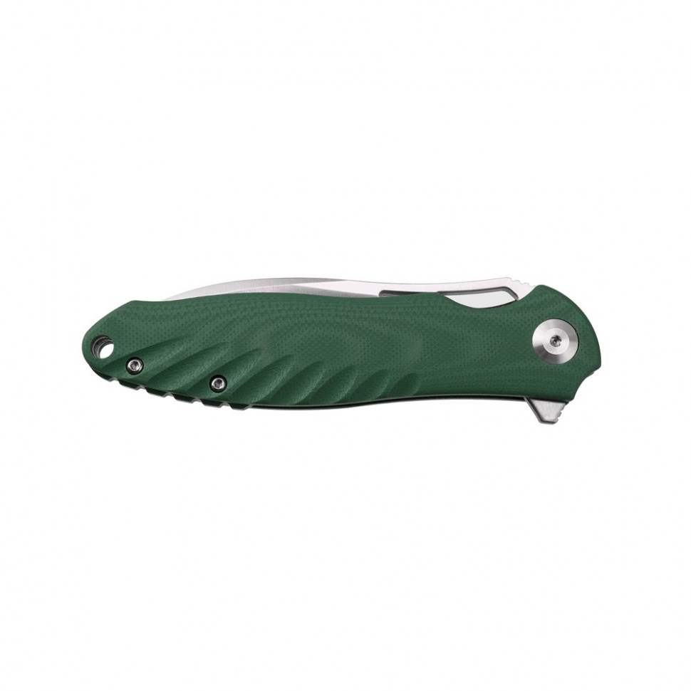 Ручка экземпляра сделана из традиционного G10, что придает ей износостойкость, защиту от воздействия высокой температуры, влаги, и устойчивость к повреждениям. Также этот материал, который представляет собой стеклотекстолит, без особого труда окрашивается. Он шероховатый на ощупь. Нож удобно держать в ладони, он не смещается, не скользит. Изделие относится к разряду так называемых флипперов.