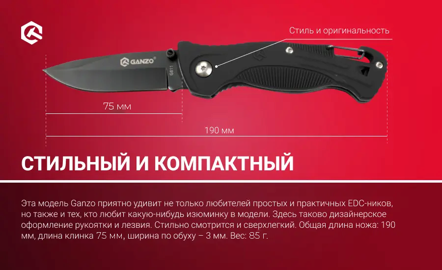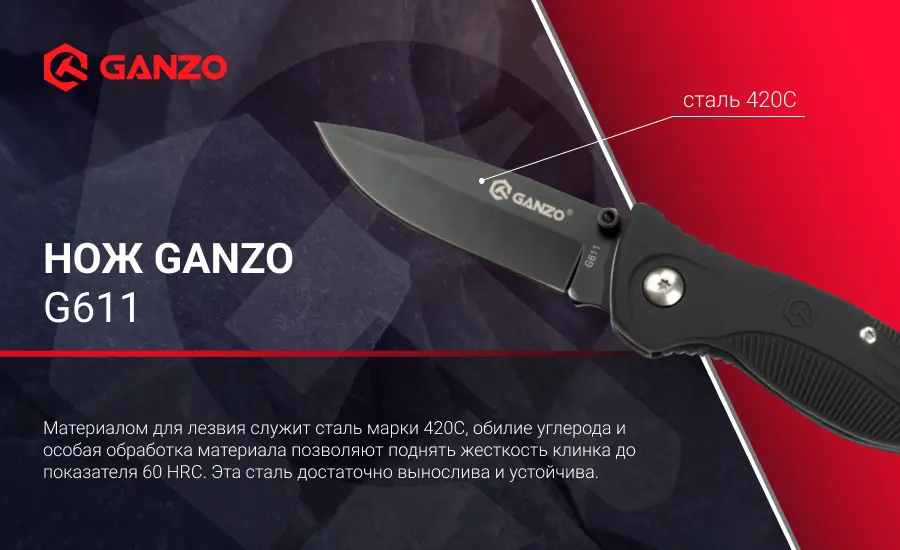 Описание ножа Ganzo G611 black: Отличная покупка – нож G611 black. Материалом для лезвия служит сталь марки 420С. Большое количество углерода и особая обработка материала позволяют поднять твердость клинка до показателя 60 HRC. При всем этом он долго остается острым.