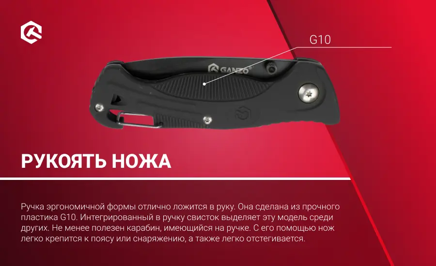 Ручка эргономичной формы отлично ложится в руку. Она сделана из прочного пластика черного цвета. Интегрированный в ручку свисток выделяет эту модель среди других. Этот дополнительный аксессуар может стать незаменимым в экстремальных ситуациях. Не менее полезным будет карабин, имеющийся на ручке. С его помощью нож легко крепится к поясу или снаряжению, и также легко отстегивается. Модель G611 black будет очень полезна для туристов и рыболовов.