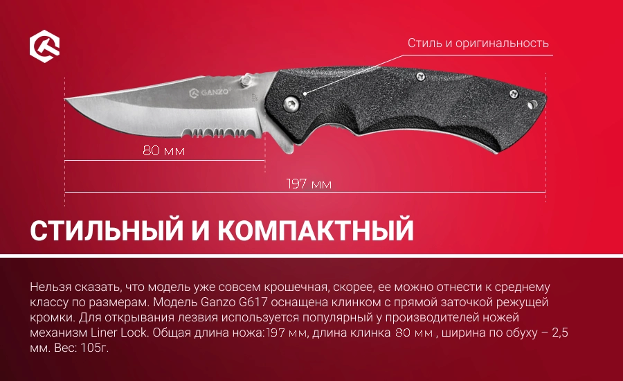 Модель относится к средним по размеру, длина ножа с открытым лезвием – 197 мм, а в сложенном виде – 117 мм. Модель Ganzo G617 имеет клинок полусеррейторного типа, т.е. часть клинка —это лезвие с гладкой заточкой, а часть - так называемое серрейторное лезвие, в котором есть пилообразные зазубрины по режущей кромке.
