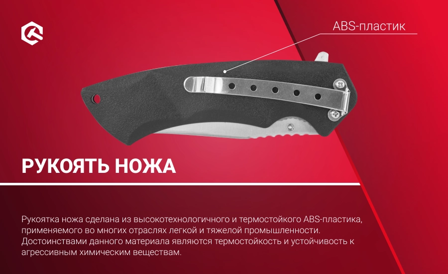 При изготовлении рукоятки ножа применен ABS-пластик, который ценится за термостойкость и устойчивость к агрессивным химическим веществам. Рукоятка ножа, как нельзя кстати, вписывается в дизайн данной модели, что делает изделие еще более привлекательным. На рукоятке имеется удобное крепление – клипса, что позволяет закрепить нож на ремне, в кармане или на экипировке. Текстурирование, нанесенное на рукоять, обеспечивает ее удобное и надежное расположение в руке, даже при экстремальных условиях эксплуатации.