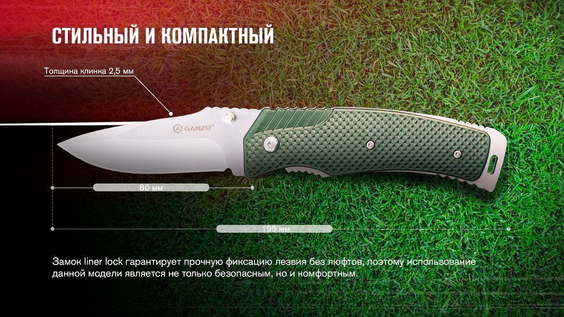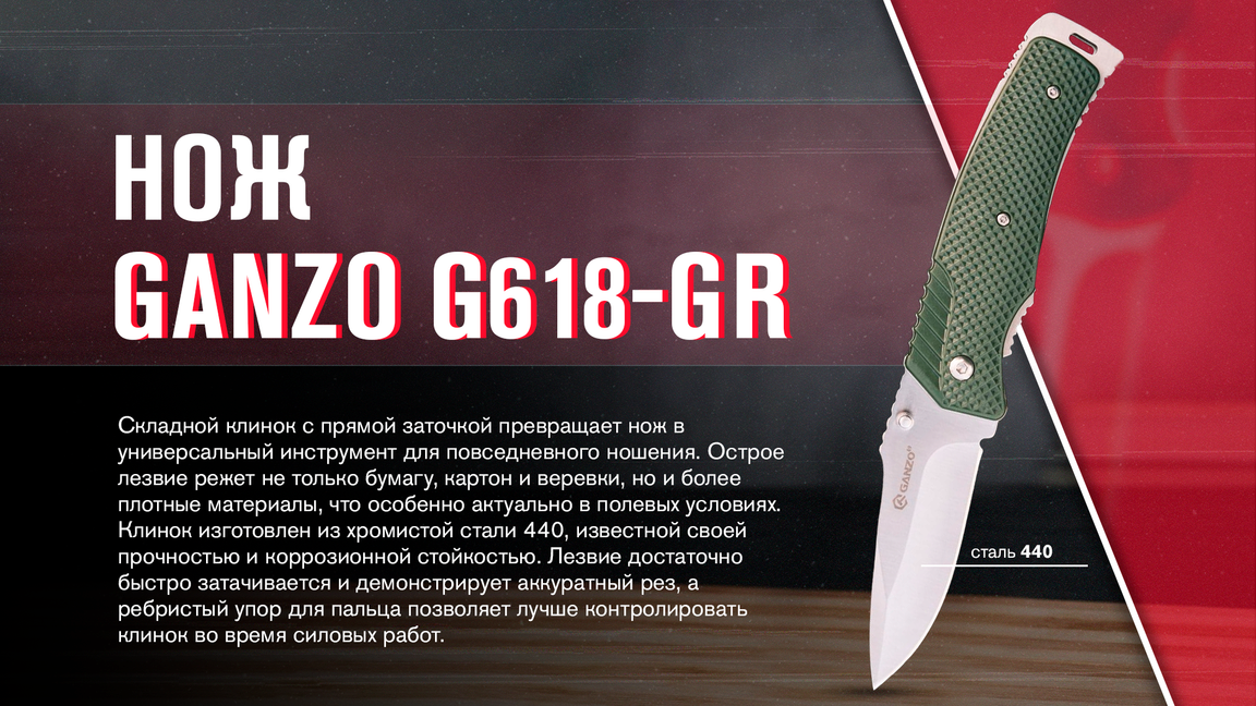 Складной клинок с прямой заточкой превращает нож Ganzo G618 в универсальный инструмент для повседневного ношения. Острое лезвие достигает 80 мм в длину и режет не только бумагу, картон и веревки, но и более плотные материалы, что особенно актуально в полевых условиях.
