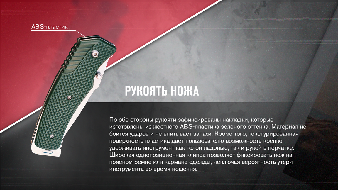 По обе стороны рукояти зафиксированы накладки, которые изготовлены из жесткого ABS-пластика зеленого оттенка. Материал не боится ударов и не впитывает запахи. Кроме того, текстурированная поверхность пластика дает пользователю возможность крепко удерживать инструмент как голой ладонью, так и рукой в перчатке.