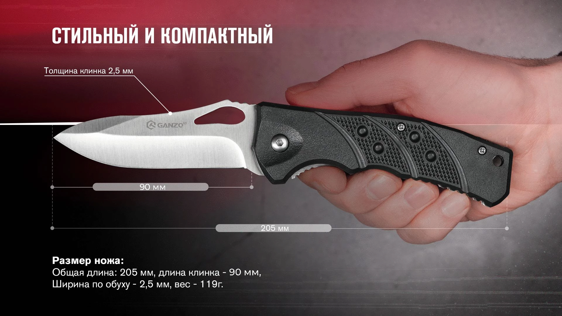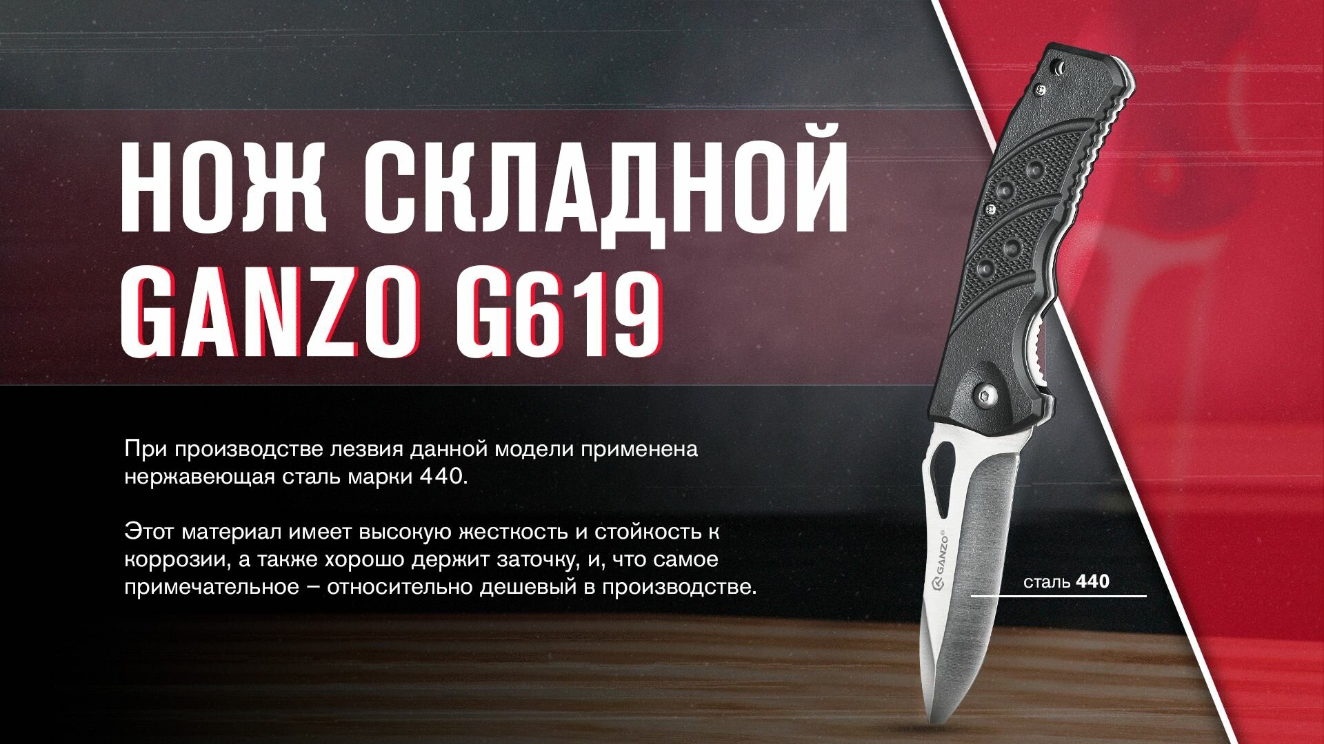 Отличительная черта данной модели – наличие у основания лезвия отверстия и удобного упора над ним. Изделие обладает такими характеристиками: длина в рабочем состоянии – 205 мм, в сложенном состоянии – 110 мм. Модель Ganzo G619 имеет клинок с прямой заточкой длиной 90 мм и толщиной по обуху 2,5 мм. Нож оснащен механизмом LinerLock, который уже не одно десятилетие применяется в производстве полуавтоматических складных ножей.