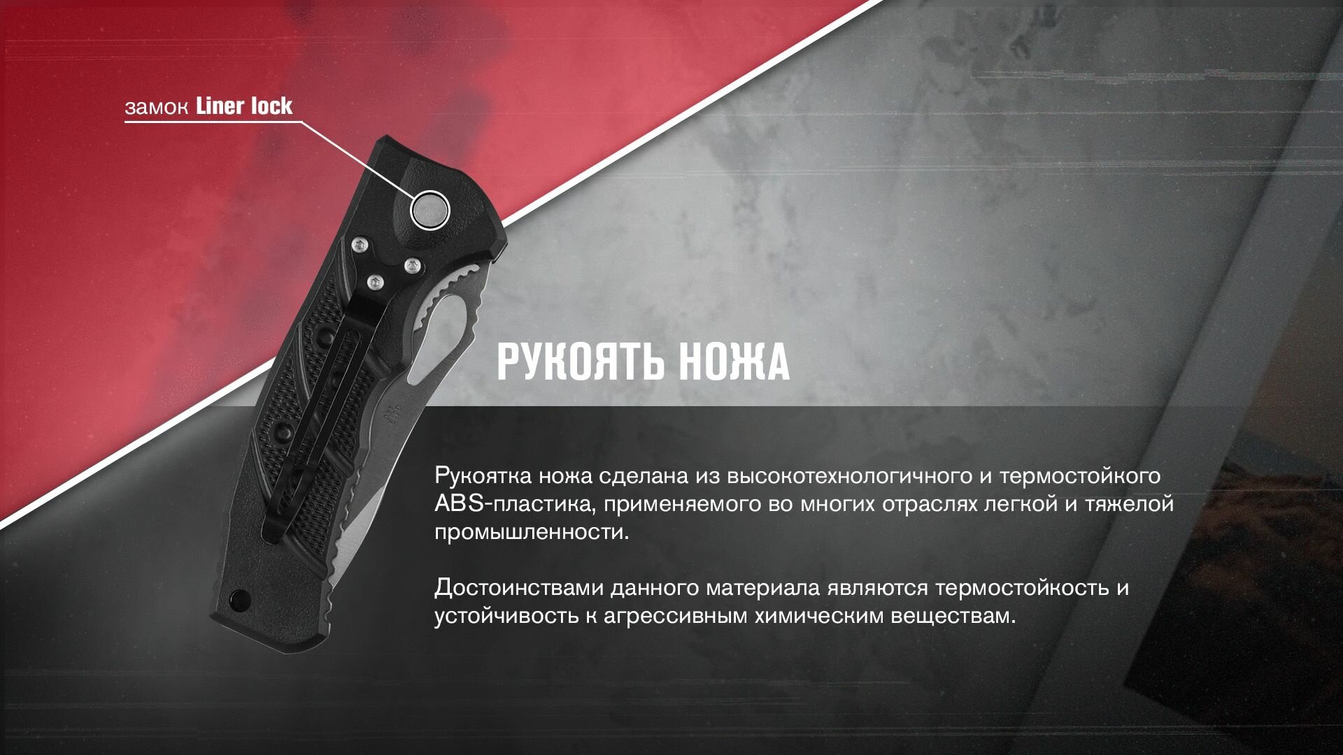 Благодаря эргономичной рукоятке, нож удобно лежит в руке. Наличие небольшого рифления на поверхности рукоятки позволяет, не напрягаясь, удерживать нож при любых погодных условиях. Изготовлена рукоять из популярного ABS-пластика, к основным достоинствам которого относятся термостойкость и невосприимчивость к химически агрессивным веществам.
