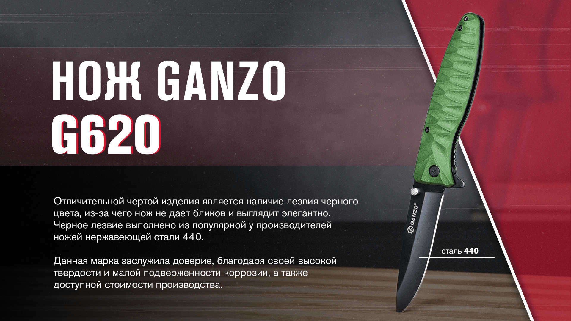 У модели Ganzo G620B-1 клинок с прямой заточкой режущей кромки. Его длина составляет 88 мм, а толщина обуха - 3 мм. Для фиксации лезвия применен механизм с многолетней историей – LinerLock, главным преимуществом которого является безопасность и удобство эксплуатации.