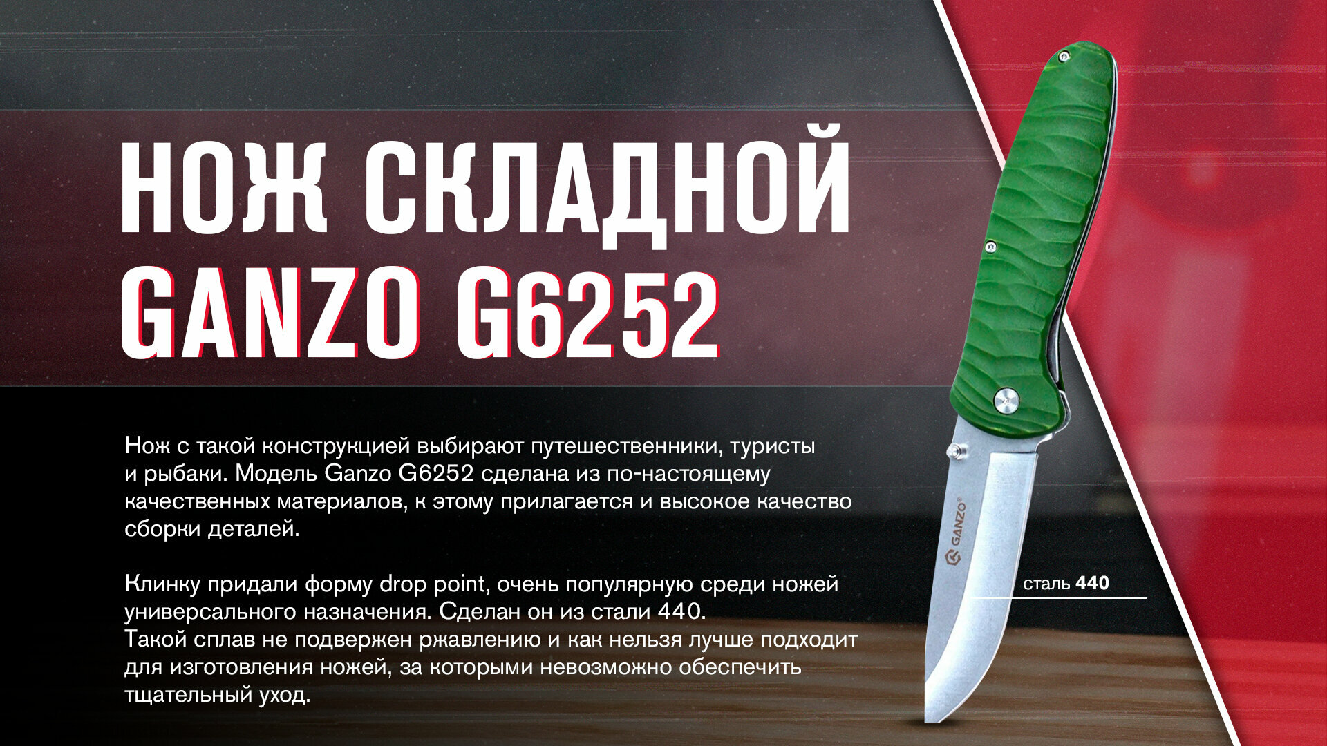 Нож Ganzo G6252 получил целый комплекс положительных качеств, которые и сделали его весьма популярной моделью. Во-первых, он складной. Именно с такой конструкцией ножи предпочитают выбирать путешественники, туристы и рыбаки. Ведь нож безопасно перевозить и он занимает минимальное пространство. Во-вторых, модель Ganzo G6252 сделана из по-настоящему качественных материалов. К этому добавляется и высокое качество сборки деталей вместе. Его клинку производители придали форму drop point, очень популярную среди ножей универсального назначения. Сделан он из стали 440. Такой сплав не подвержен ржавлению и как нельзя лучше подходит для изготовления ножей, за которыми невозможно обеспечить тщательный уход. Заточено лезвие ножа ровно до самого кончика. Такой тип заточки подойдет для разрезания практически любых материалов. А кроме того, его легко подточить при помощи самых простых точилок. Еще одна особенность клинка в том, что его поверхность сделана полуматовой. Она подверглась шлифовке stone-washed, после чего отражает только прямые лучи солнца. Нужно отметить, что такой вариант обработки позволяет скрывать мелкие царапинки, которые могут возникнуть на лезвии со временем, и нож будет прекрасно выглядеть долгое время.