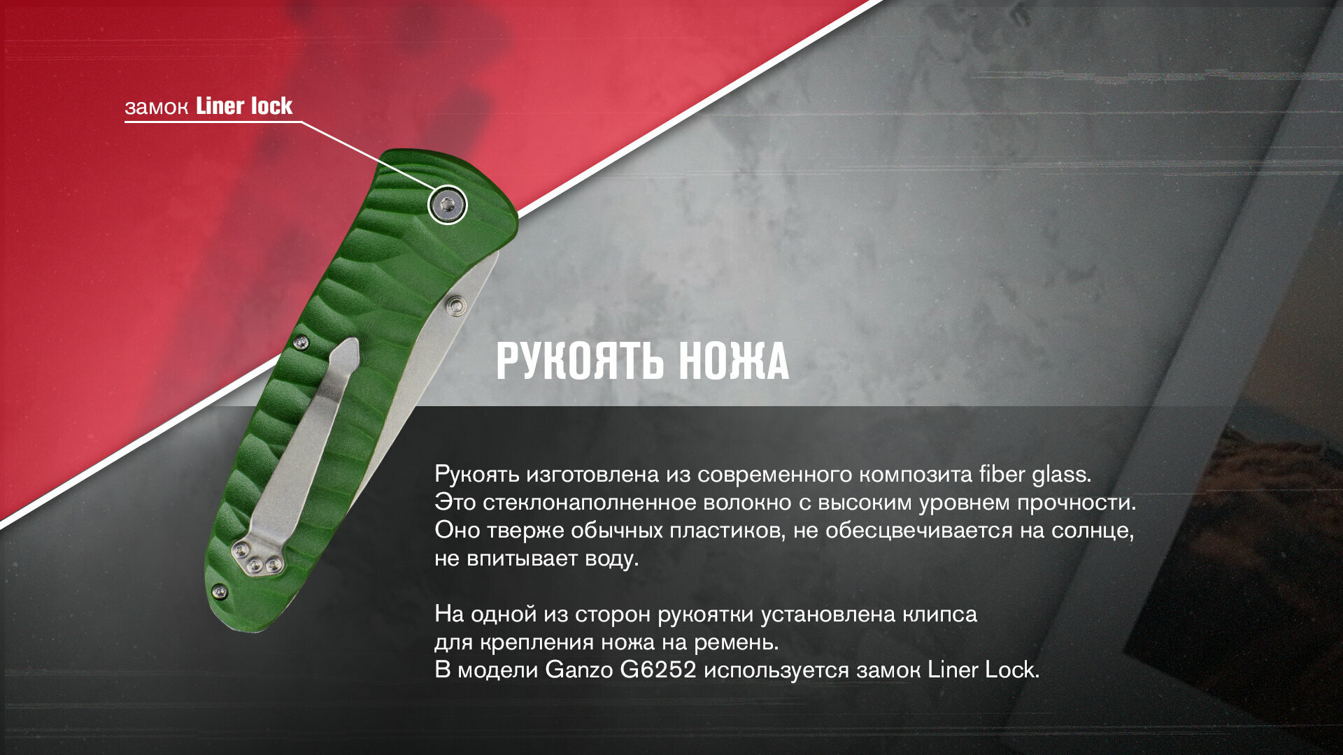 В модели Ganzo G6252 используется Liner Lock блокиратор для лезвия.